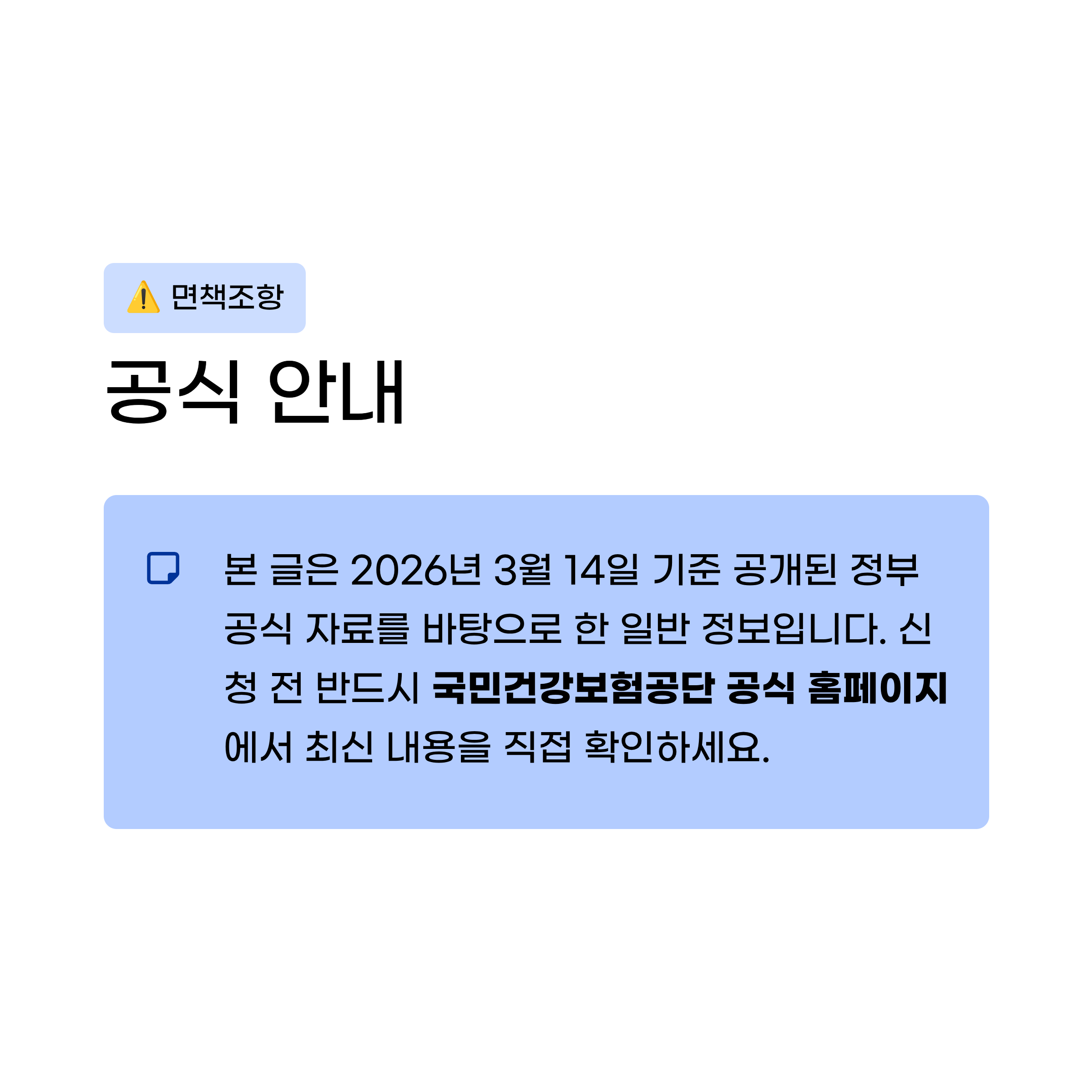 ⚠️ 면책조항: 본 글은 2026년 3월 14일 기준 공개된 정부 공식 자료를 바탕으로 작성된 일반 정보 제공용 콘텐츠입니다. 지원 내용·금액 기준은 정부 정책에 따라 변경될 수 있으므로, 신청 전 반드시 국민건강보험공단 공식 홈페이지에서 최신 내용을 직접 확인하시기 바랍니다.