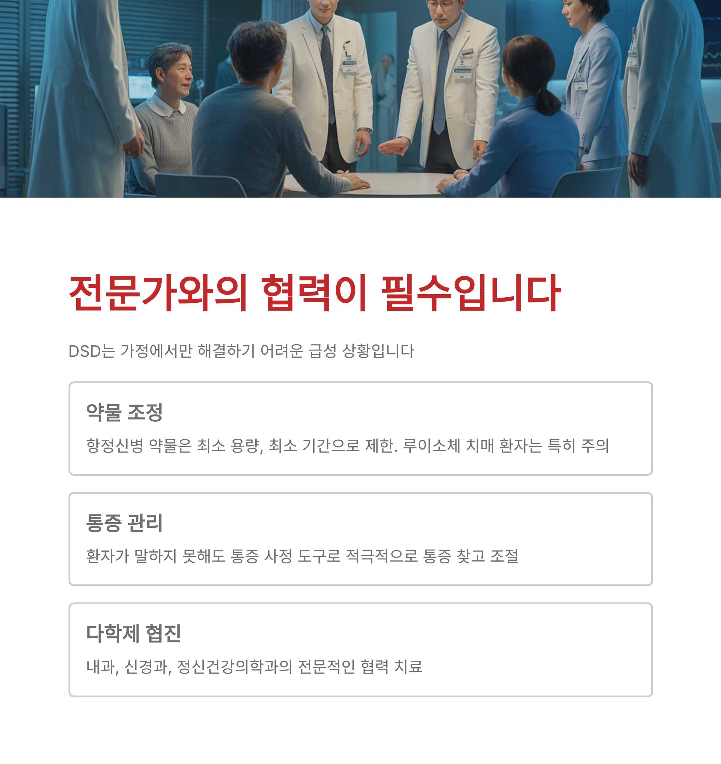 DSD는 가정에서만 해결하기 어렵습니다. 급성기에는 전문 의료진 (내과, 신경과, 정신건강의학과)의 협진이 필수적입니다.