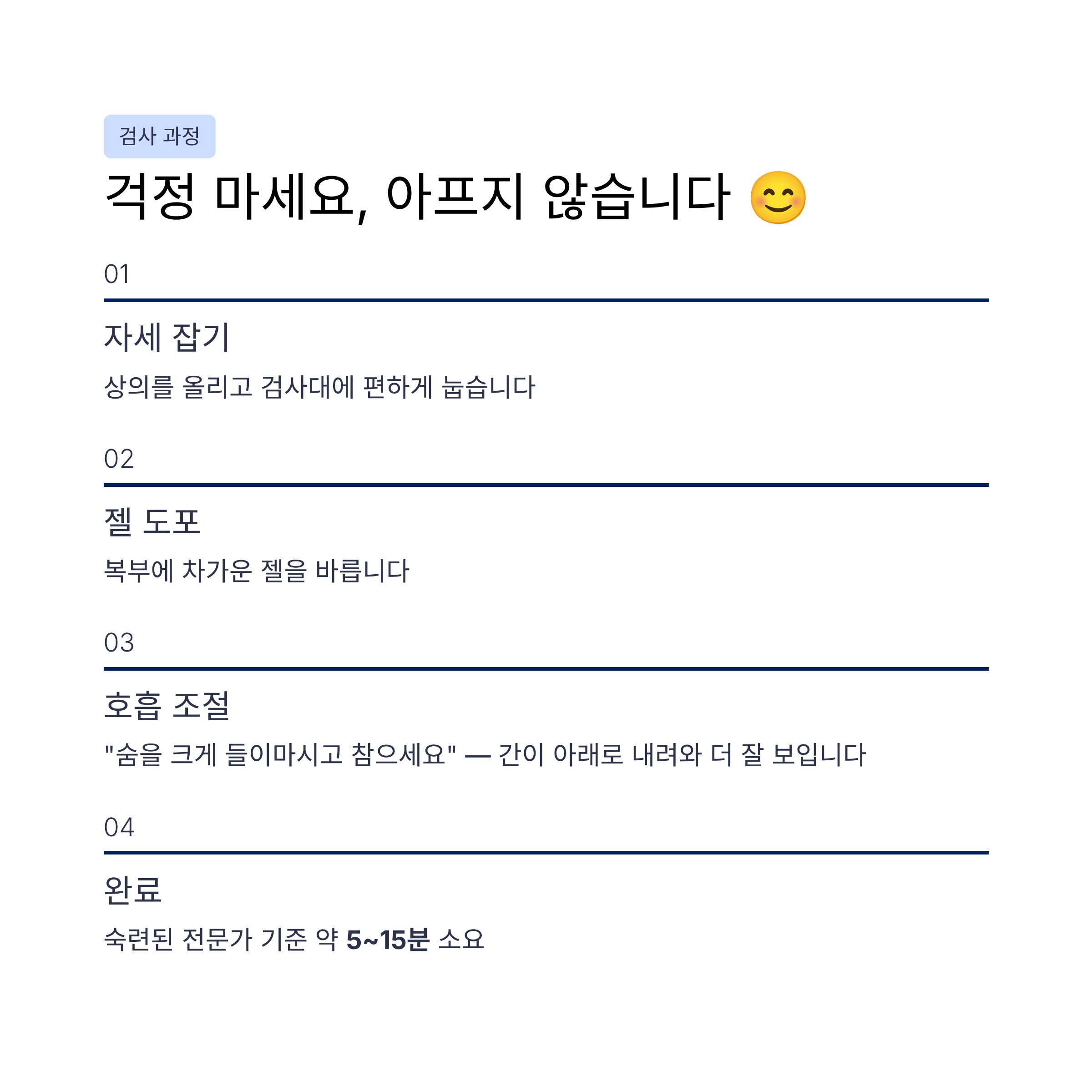 - 호흡 조절: "숨을 크게 들이마시고 참으세요"라는 지시에 따릅니다. 이는 폐에 공기가 차면서 간을 아래로 밀어내 더 잘 보이게 하기 위함입니다.