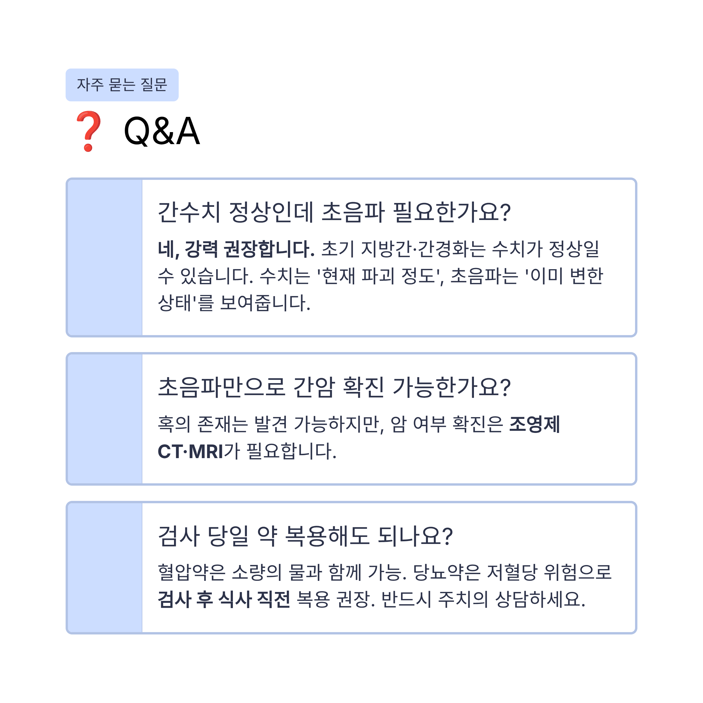A. 네, 강력히 권장합니다. 초기 지방간이나 간경화 초기에는 간 수치가 정상으로 나올 수 있습니다. 수치는 '현재 파괴되는 정도'를 말해주지만, 초음파는 '이미 변해버린 상태'를 보여주기 때문입니다.