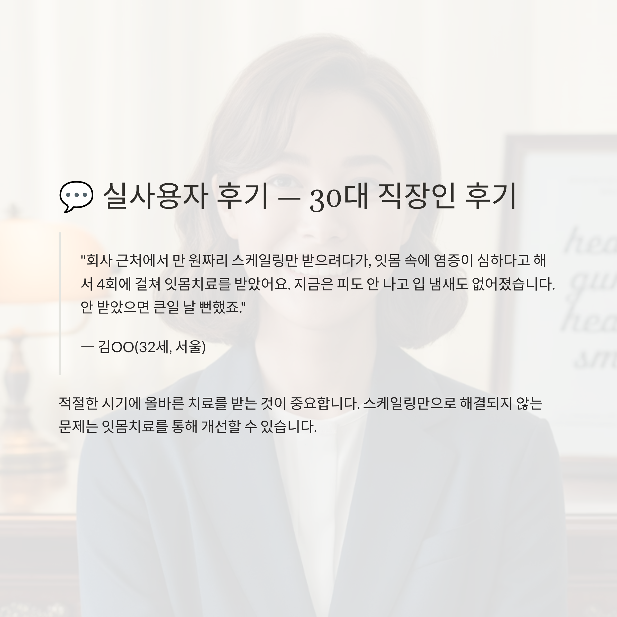 👉 “잇몸치료는 이미 생긴 병을 치료하는 것입니다. 스케일링으로 예방 못 했던 결과죠.”