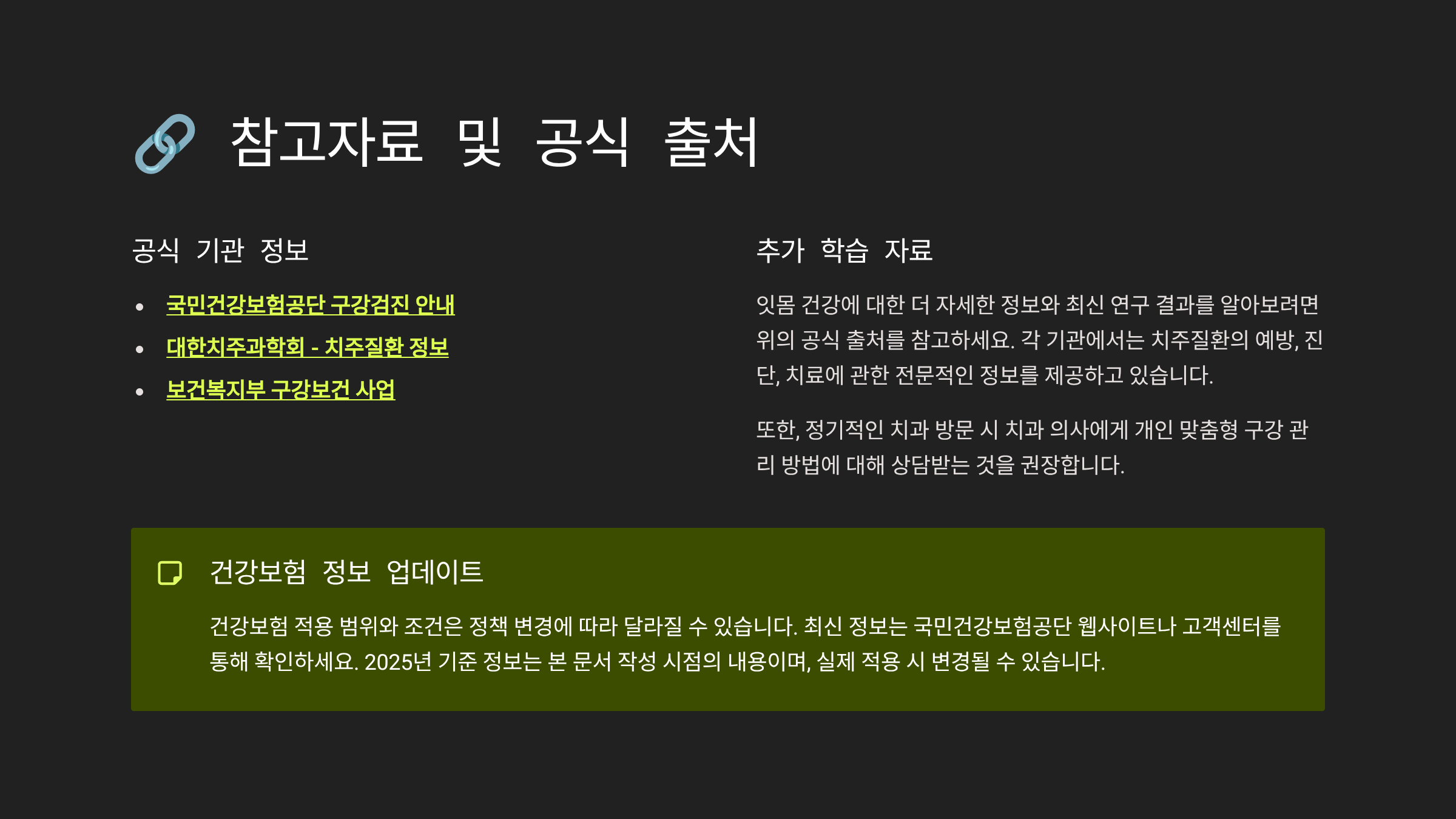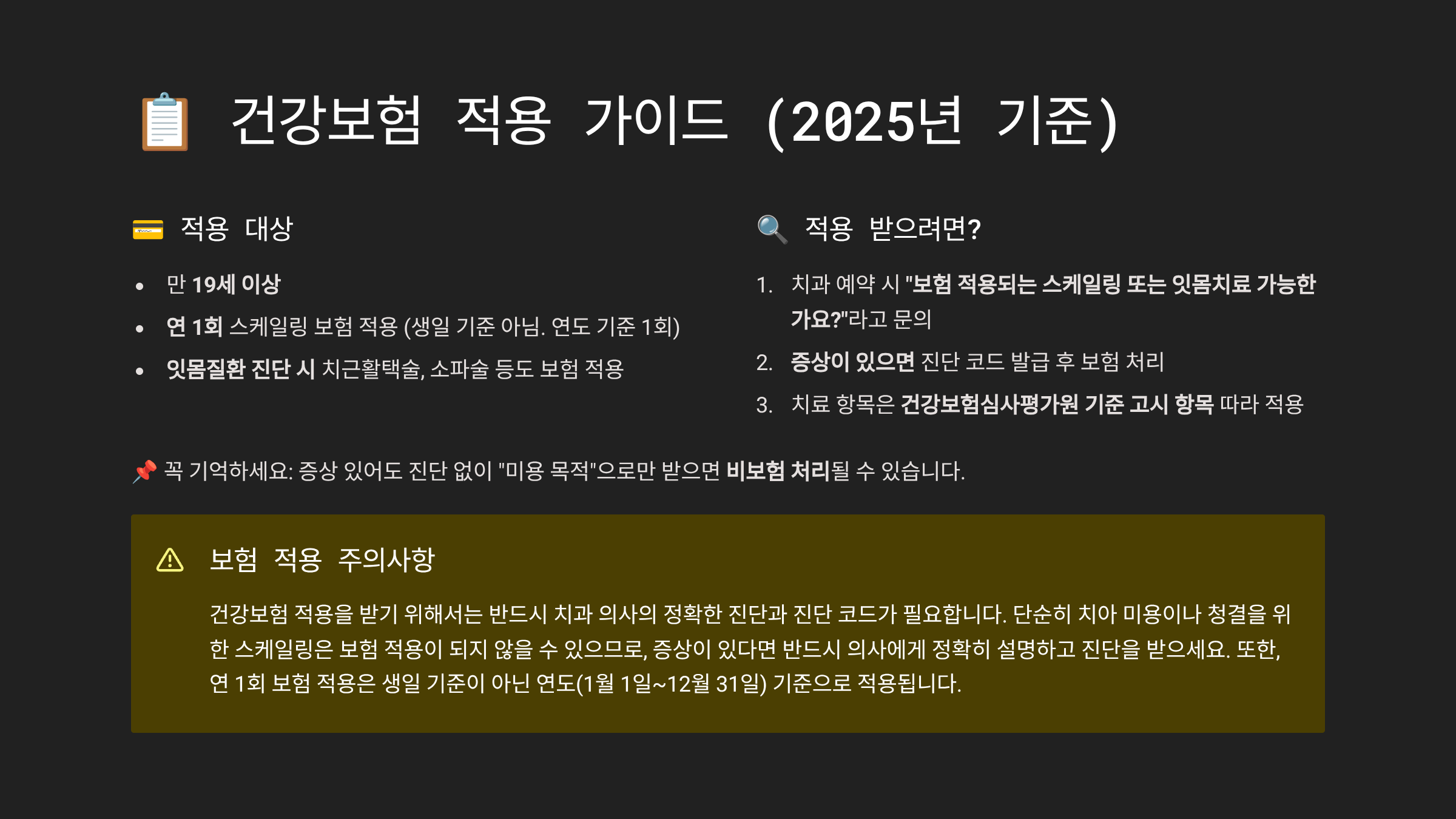 - 치과 예약 시 **“보험 적용되는 스케일링 또는 잇몸치료 가능한가요?”**라고 문의
