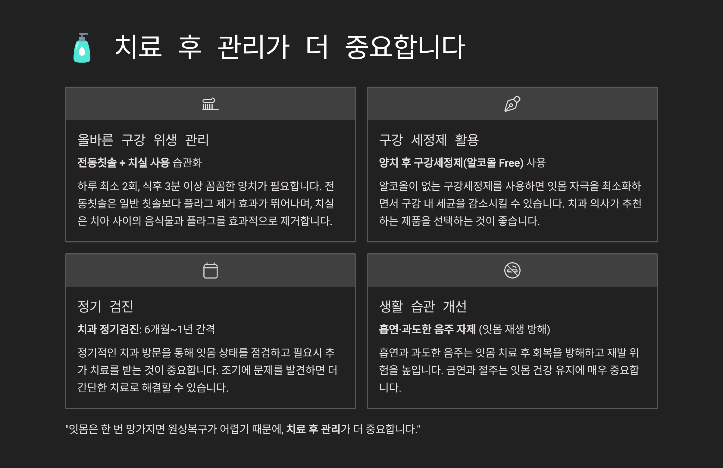 - 흡연·과도한 음주 자제 (잇몸 재생 방해)
