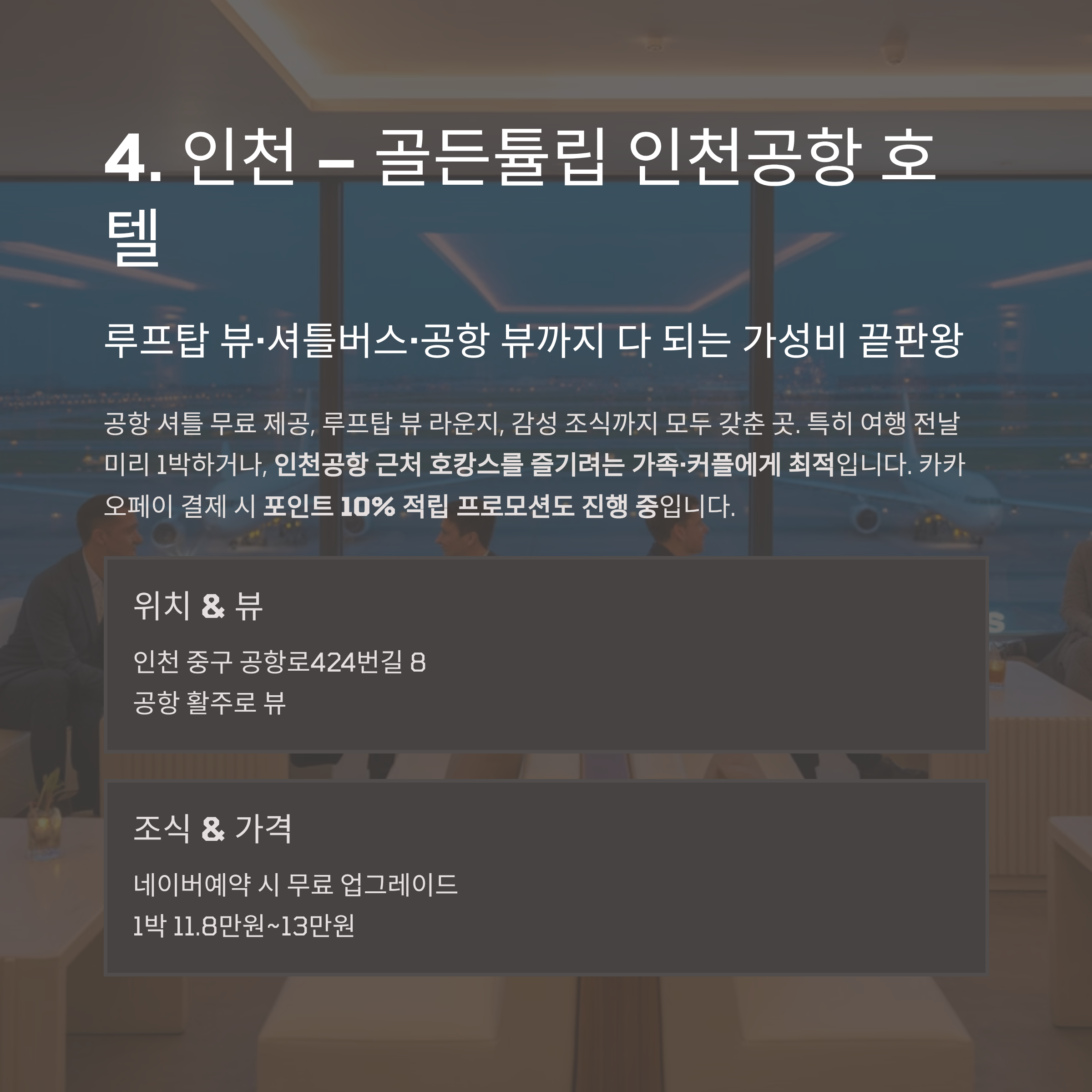 - “인천 골든튤립은 가격도 착하고 공항뷰가 이 정도면 대박이죠.”