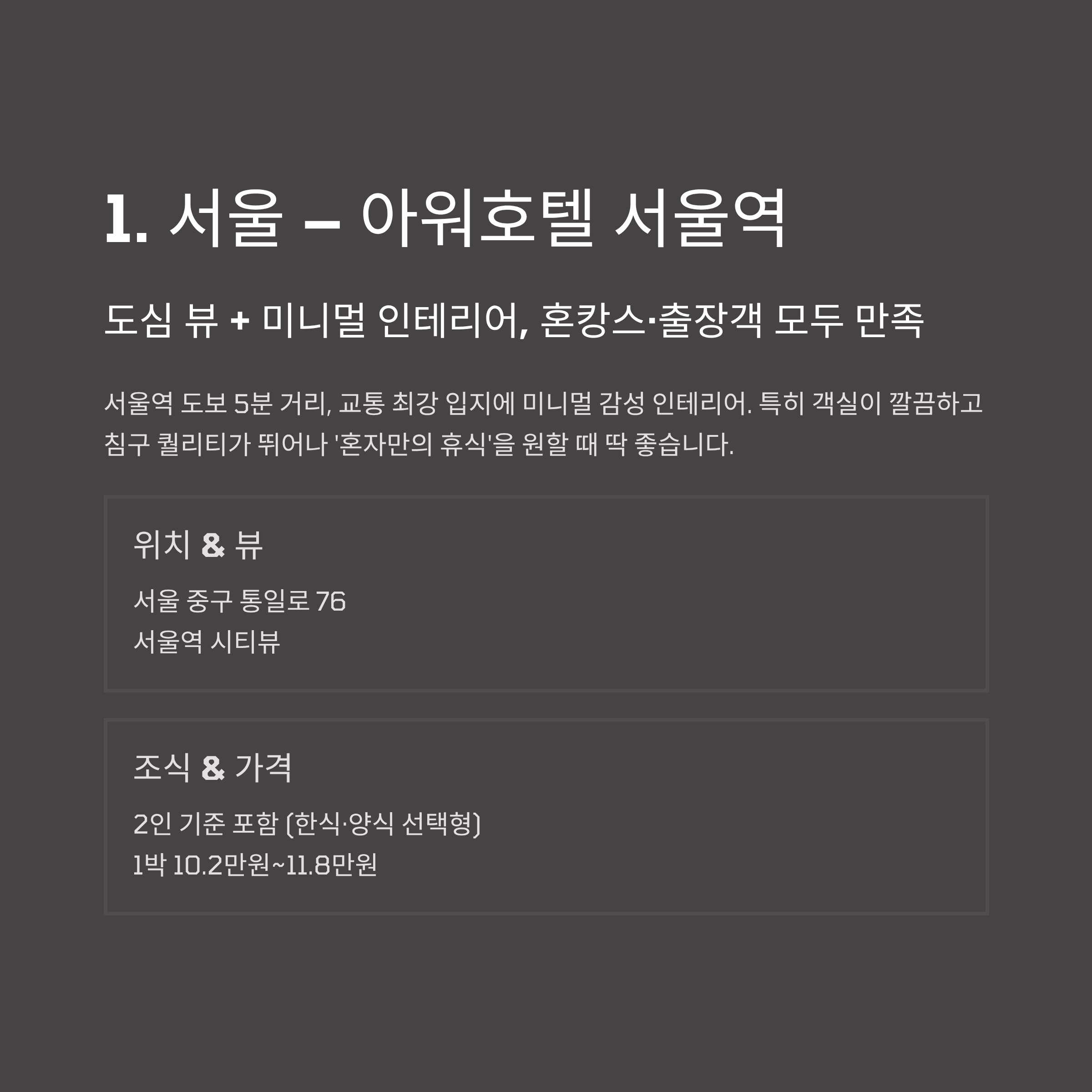 특히 객실이 깔끔하고 침구 퀄리티가 뛰어나 ‘혼자만의 휴식’을 원할 때 딱 좋습니다.