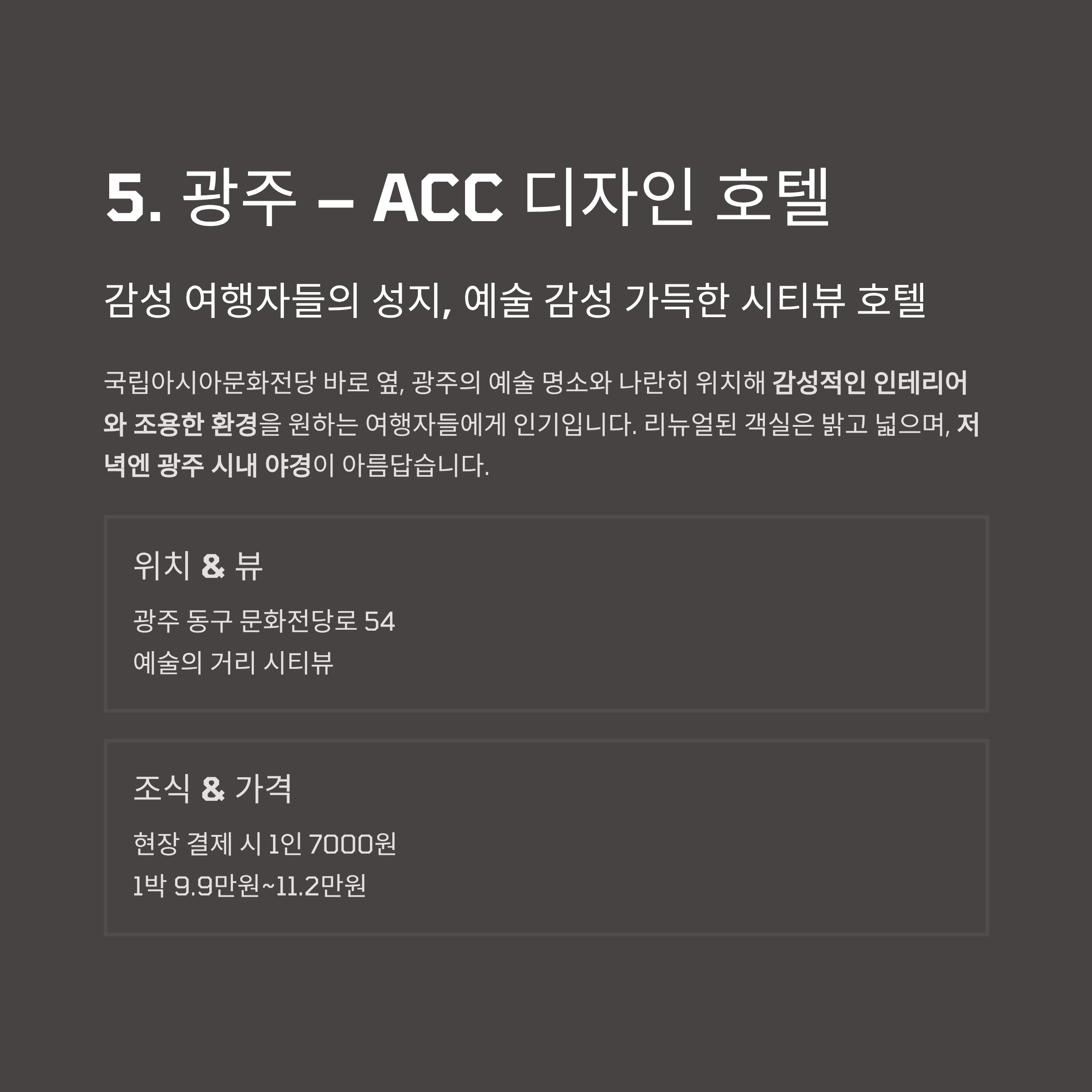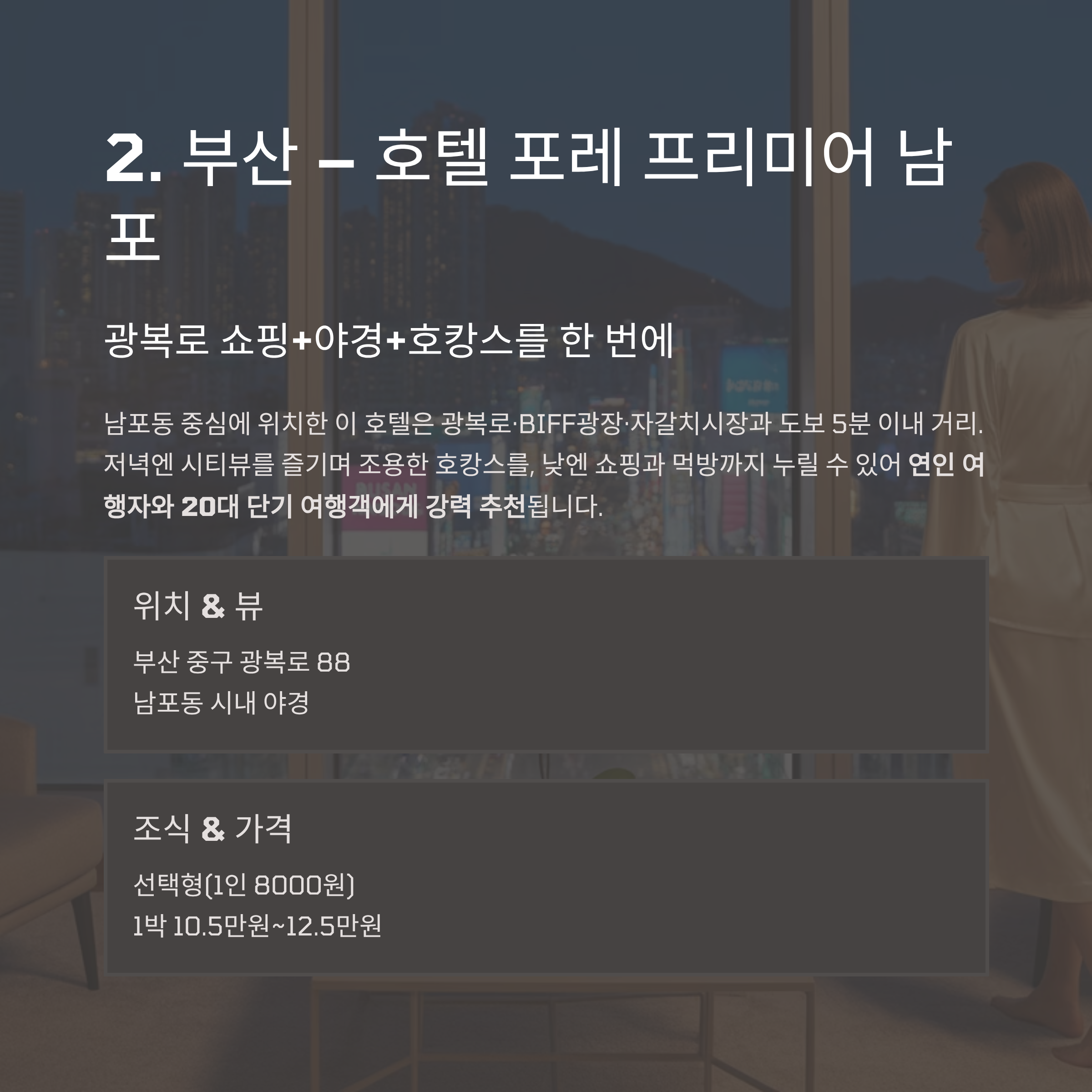 | 커플 감성 여행 | 호텔 포레 부산 / ACC 광주 | 야경·감성 인테리어·도보 여행 최적화 |