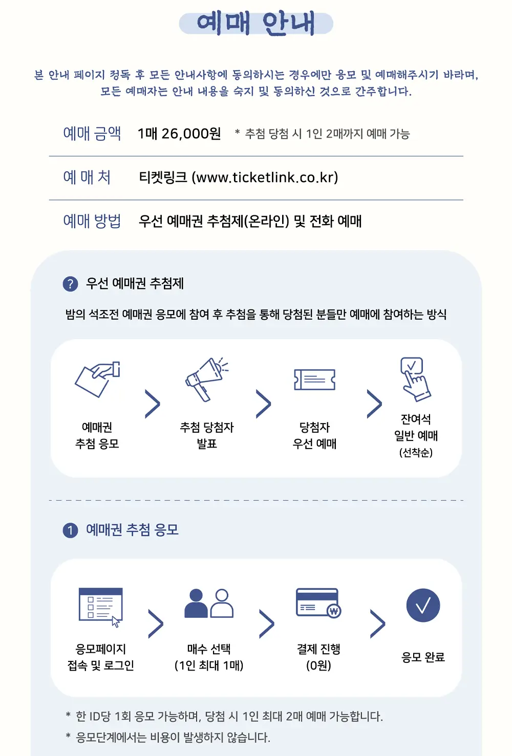 | 예매처 | 티켓링크 (응모 후 추첨) |