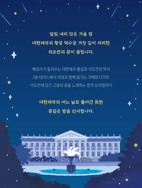 행사 참가자들은 석조전 내부를 탐방하며 황실의 생활과 당시의 분위기를 직접 느낄 수 있습니다. 또한, 2층 테라스에서 가배와 디저트를 즐기며 덕수궁의 야경을 감상할 수 있으며, 접견실에서는 대한제국 황실의 이야기를 담은 창작 뮤지컬을 관람할 수 있습니다.