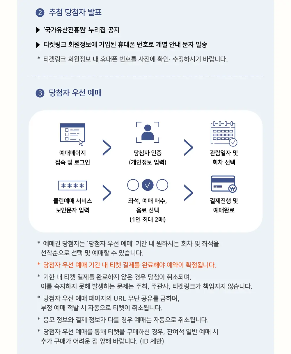 참고사항: 예매 당첨 후 24시간 내 결제를 완료하지 않으면 자동 취소됩니다. 불법 예매 및 양도는 금지되어 있으며, 이를 위반할 경우 추후 참여가 제한될 수 있습니다.