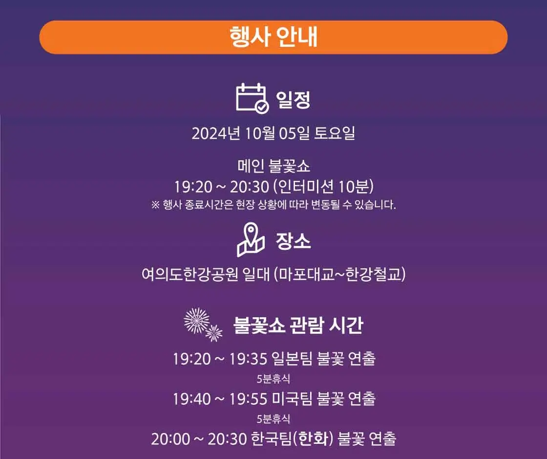 | 2024 서울세계불꽃축제 가는 방법(교통안내, 자차, 지하철, 버스) (0) | 2024.09.08 |
