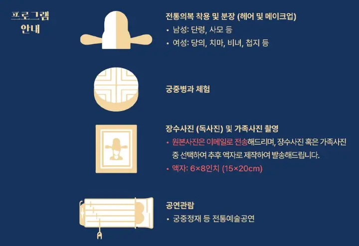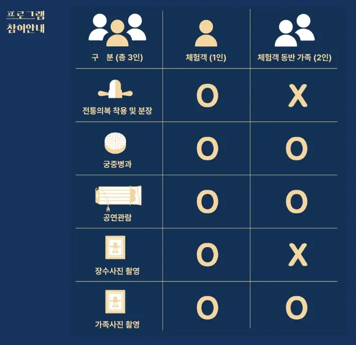 - 참가비: 1매당 50,000원으로, 전통 의상 착용, 궁중 병과 체험, 장수 사진 촬영, 공연 관람 등이 포함되어 있습니다.
