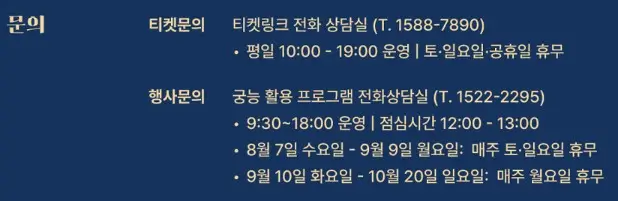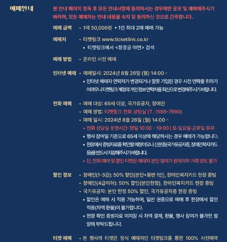 - 전화 예매: 만 65세 이상, 국가유공자, 장애인 대상, 티켓링크 전화 상담실을 통해 예약 가능