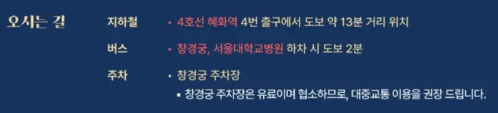 - 행사 장소는 창경궁 문정전이며, 지하철 혜화역 4번 출구에서 도보로 약 13분 거리입니다. 창경궁 내 주차장은 협소하므로 대중교통 이용을 권장드립니다.