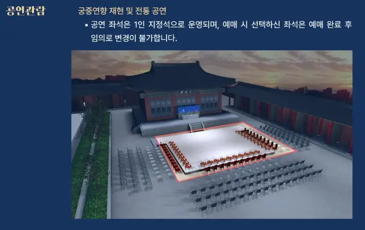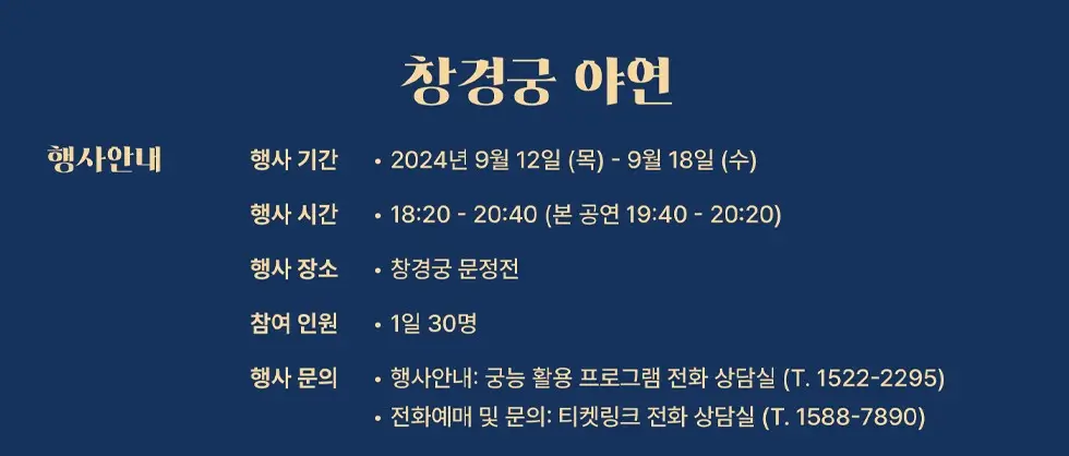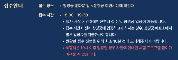 - 장소: 창경궁 문정전에서 개최되며, 행사 당일 오후 6시부터 입장 가능합니다.
