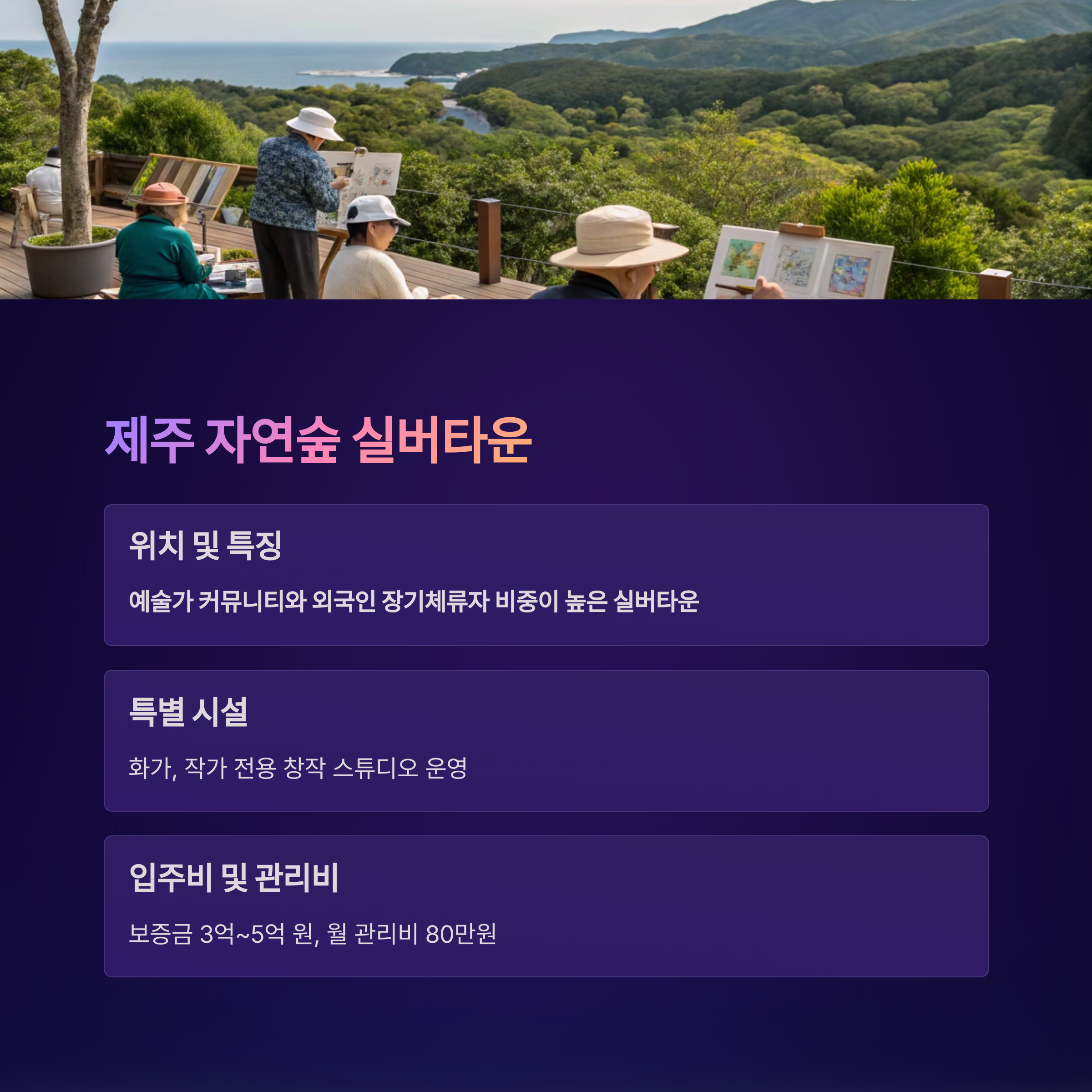 | 자연숲 | 제주 | 3~5억 | 80만 | 예술 커뮤니티 |