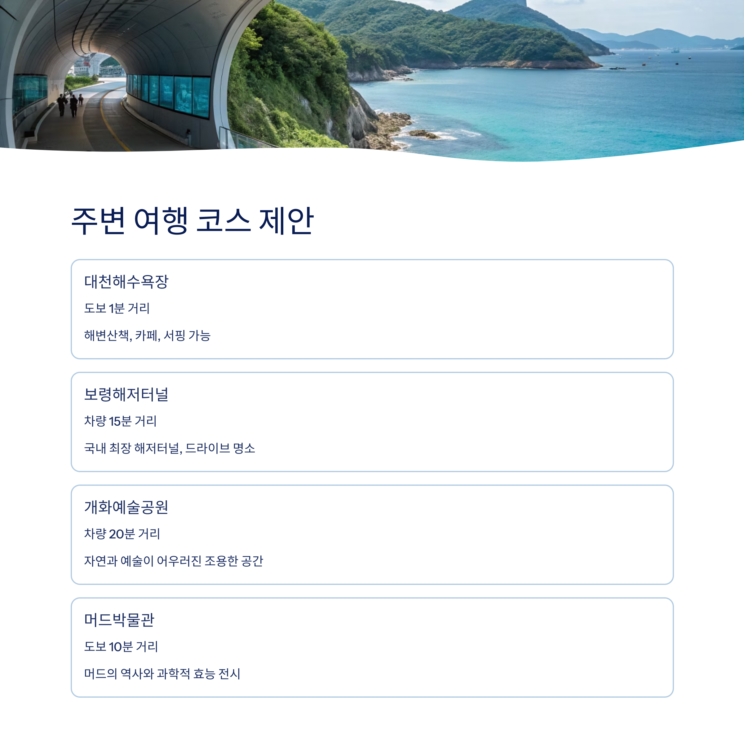 | 보령해저터널 | 차량 15분 | 국내 최장 해저터널, 드라이브 명소 |