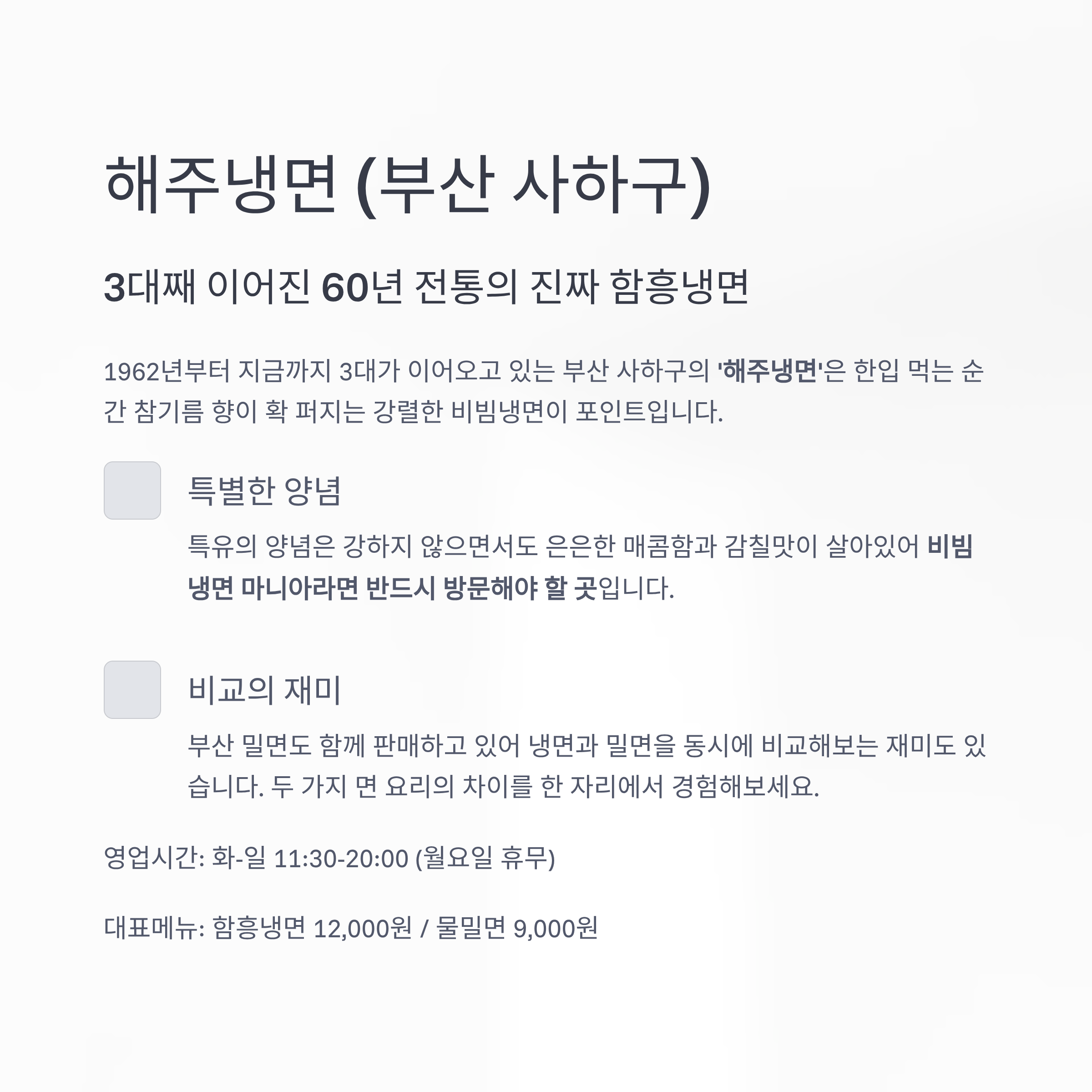 해주냉면 (부산 사하구) : 3대째 이어진 60년 전통의 진짜 함흥냉면