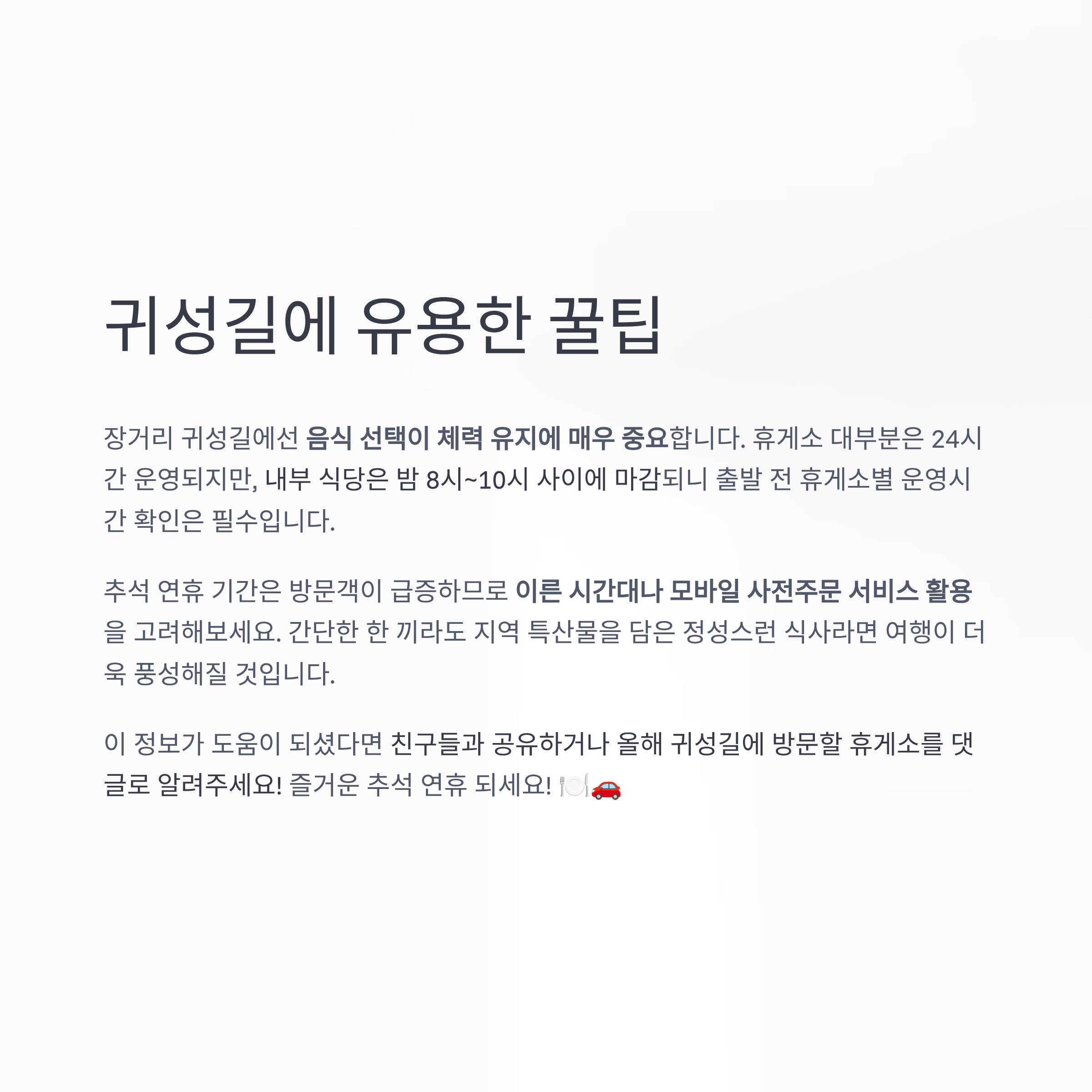 이번 글에서는 수도권 출발 기준, 주요 귀성 방향별로 꼭 들러야 할 전국의 지역별 휴게소 맛집을 소개합니다.