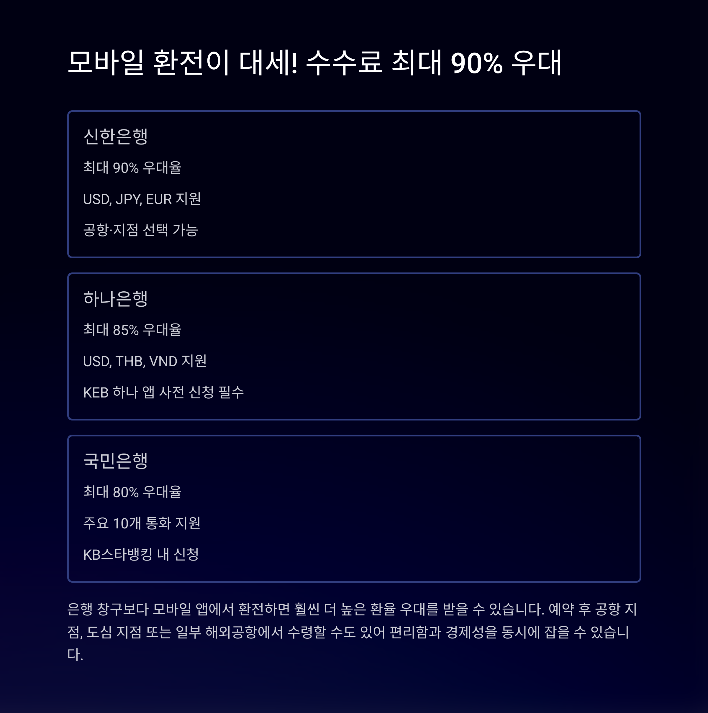 | 신한은행 | 최대 90% | USD, JPY, EUR | 공항·지점 선택 가능 |