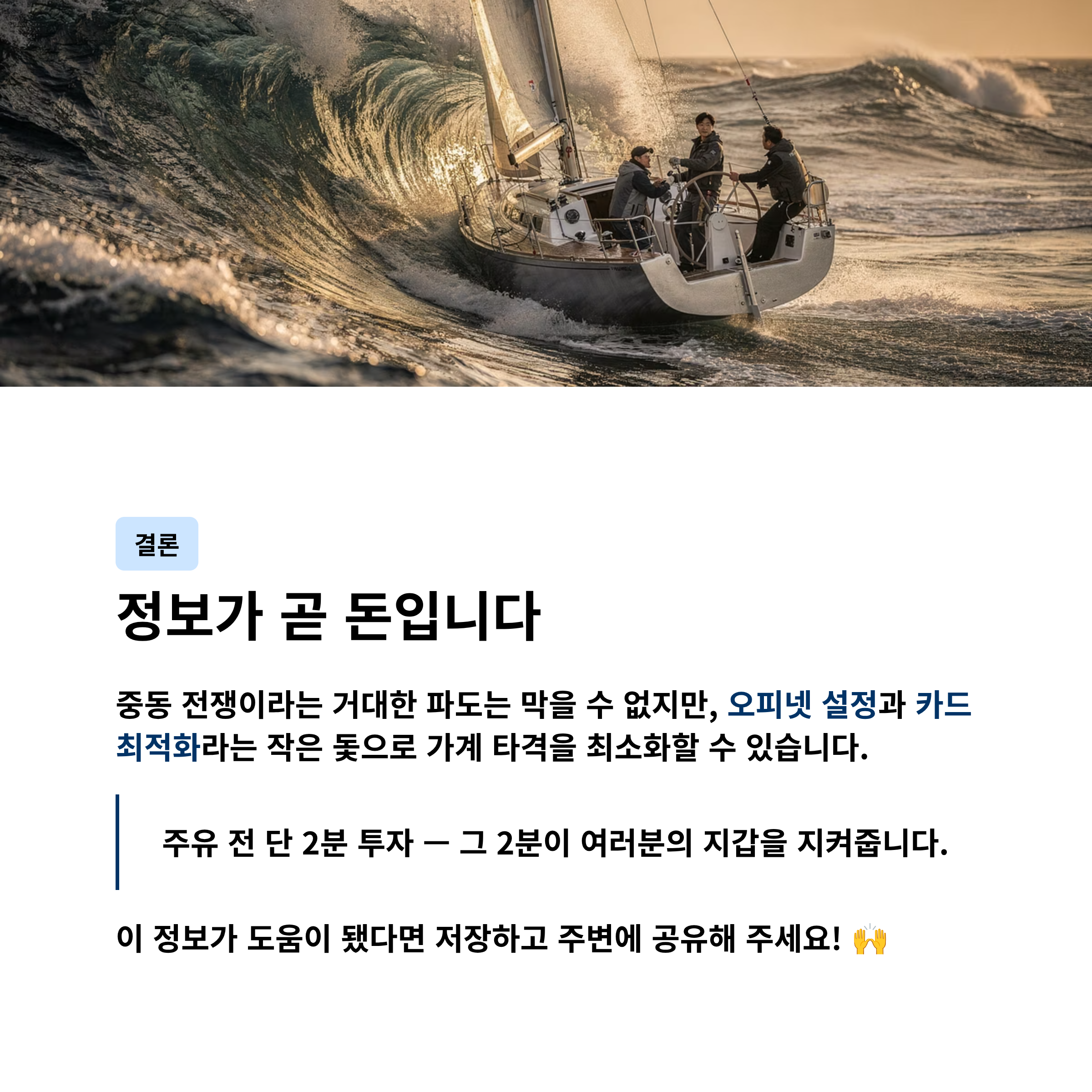 중동 전쟁이라는 거대한 파도를 우리가 막을 수는 없지만, 오피넷 설정과 카드 최적화라는 작은 돛을 조정하면 가계 경제의 타격을 최소화할 수 있습니다. 오늘부터 주유 전 2분만 투자해 보세요. 그 2분이 여러분의 지갑을 지켜줄 것입니다.