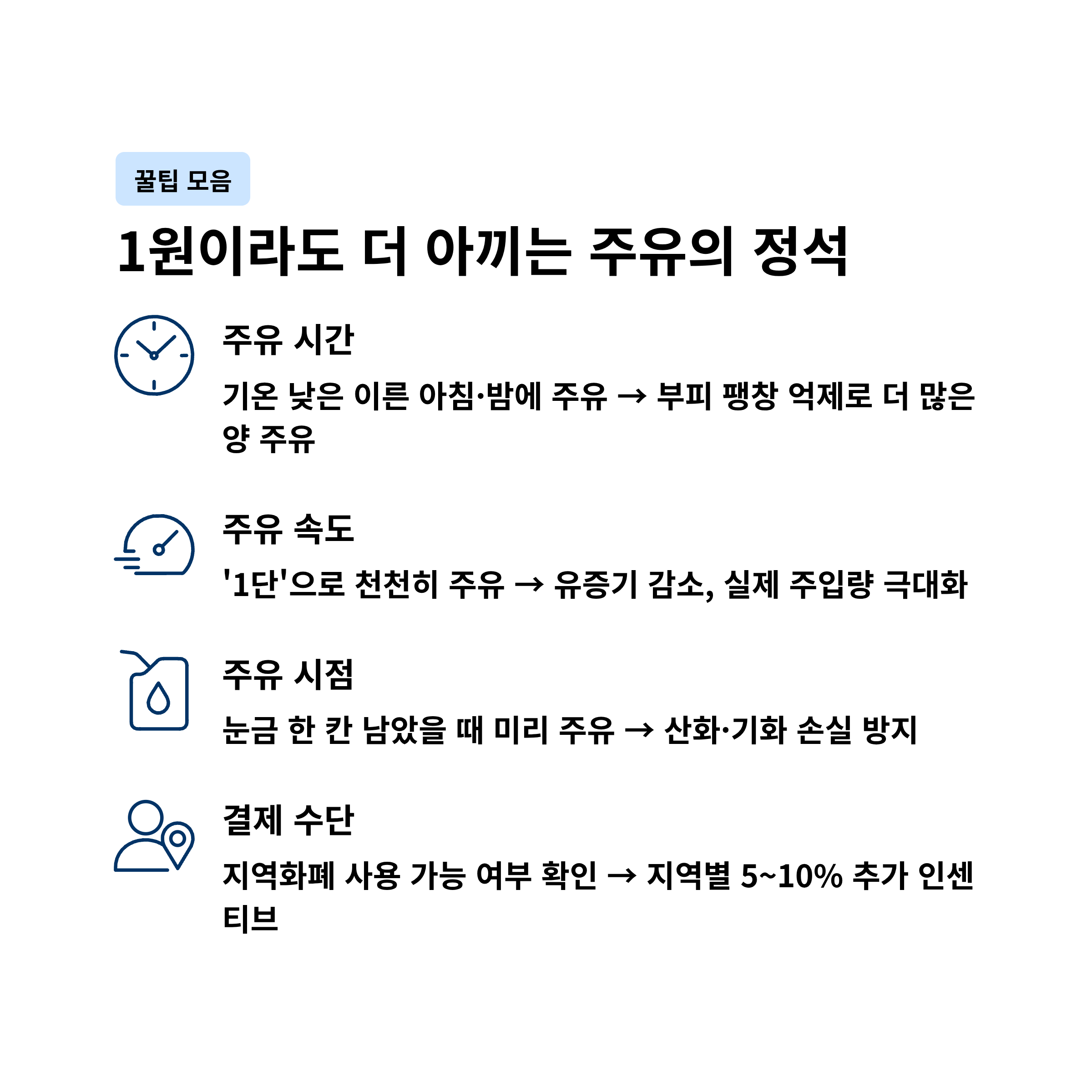 | 주유 시간 | 기온이 낮은 이른 아침이나 밤에 주유 | 기름의 부피 팽창 억제로 더 많은 양 주유 |