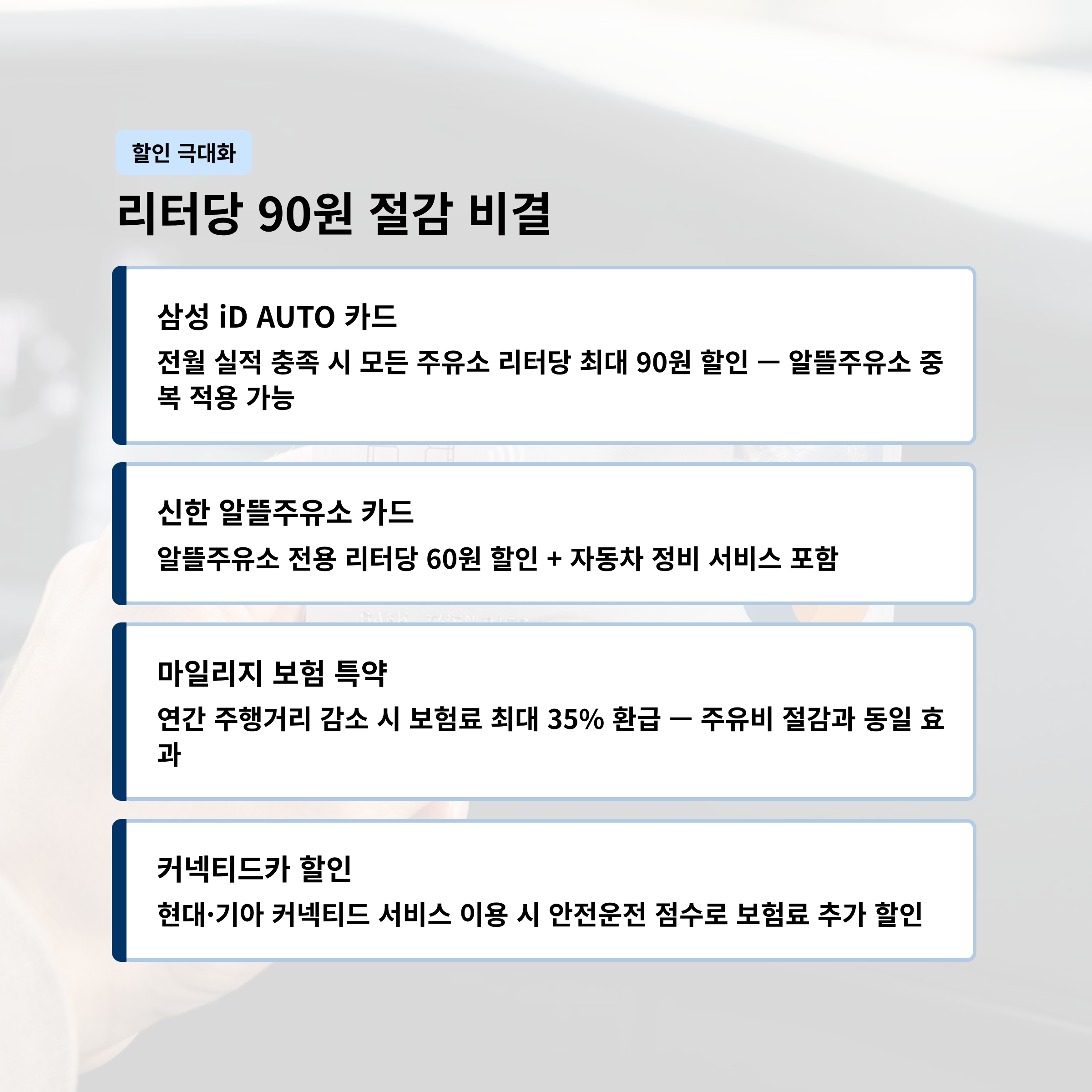 3. 리터당 90원 절감! 주유 할인 카드 & 자동차보험 연계 팁