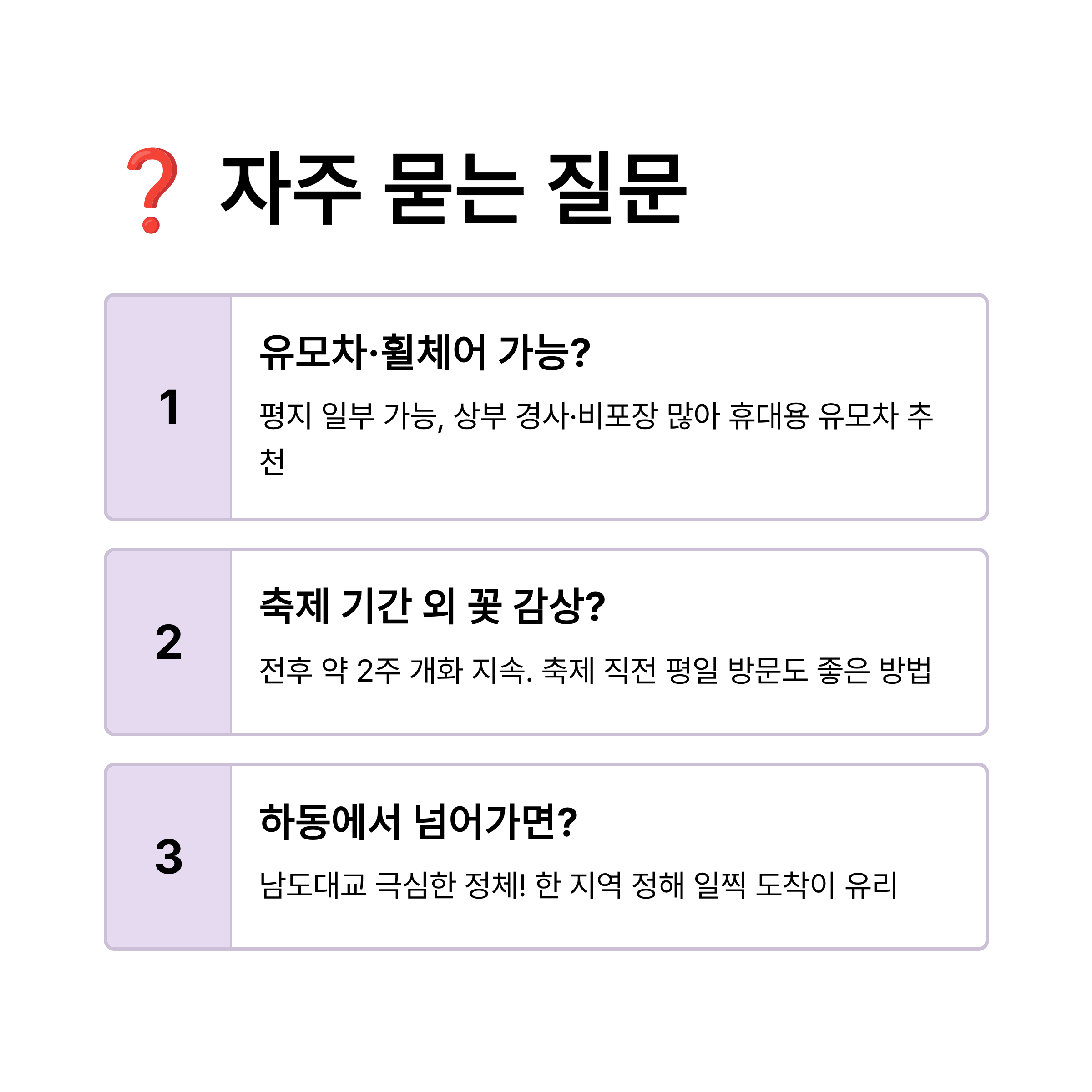 Q2. 축제 기간 외에 가도 꽃을 볼 수 있나요? A2. 개화는 축제 전후로 약 2주간 지속됩니다. 인파가 두렵다면 축제 시작 직전 평일이나 축제 종료 직후 방문하는 것도 좋은 방법입니다.