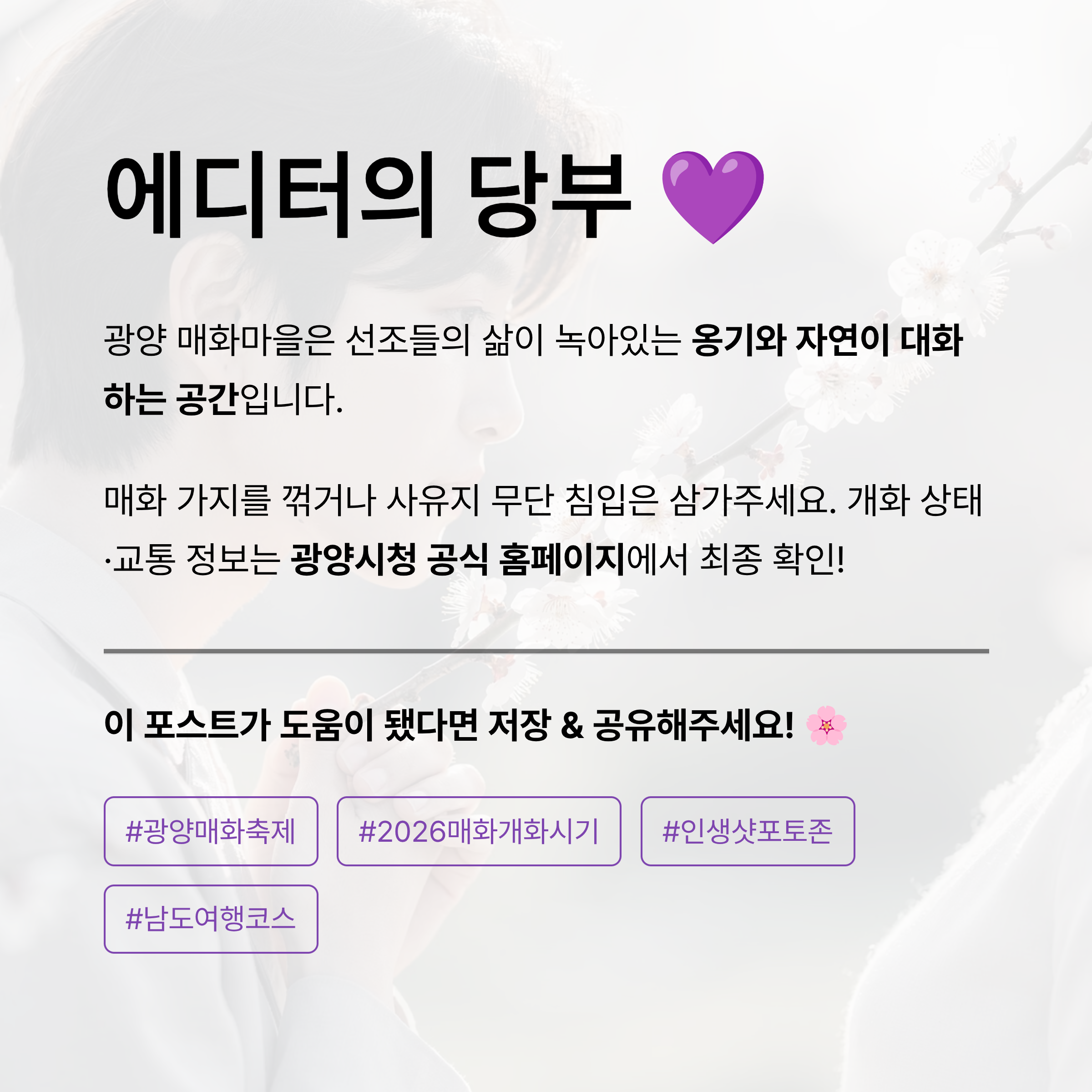 #광양매화축제 #광양매화마을 #2026매화개화시기 #광양가볼만한곳 #청매실농원 #인생샷포토존 #매화출사 #남도여행코스 #봄꽃축제일정 #광양여행꿀팁 #섬진강매화 #매화마을주차 #광양맛집 #매실아이스크림 #전국꽃지도 #인생사진찍는법 #국내봄여행지추천 #주말나들이 #가족여행스팟 #데이트코스추천