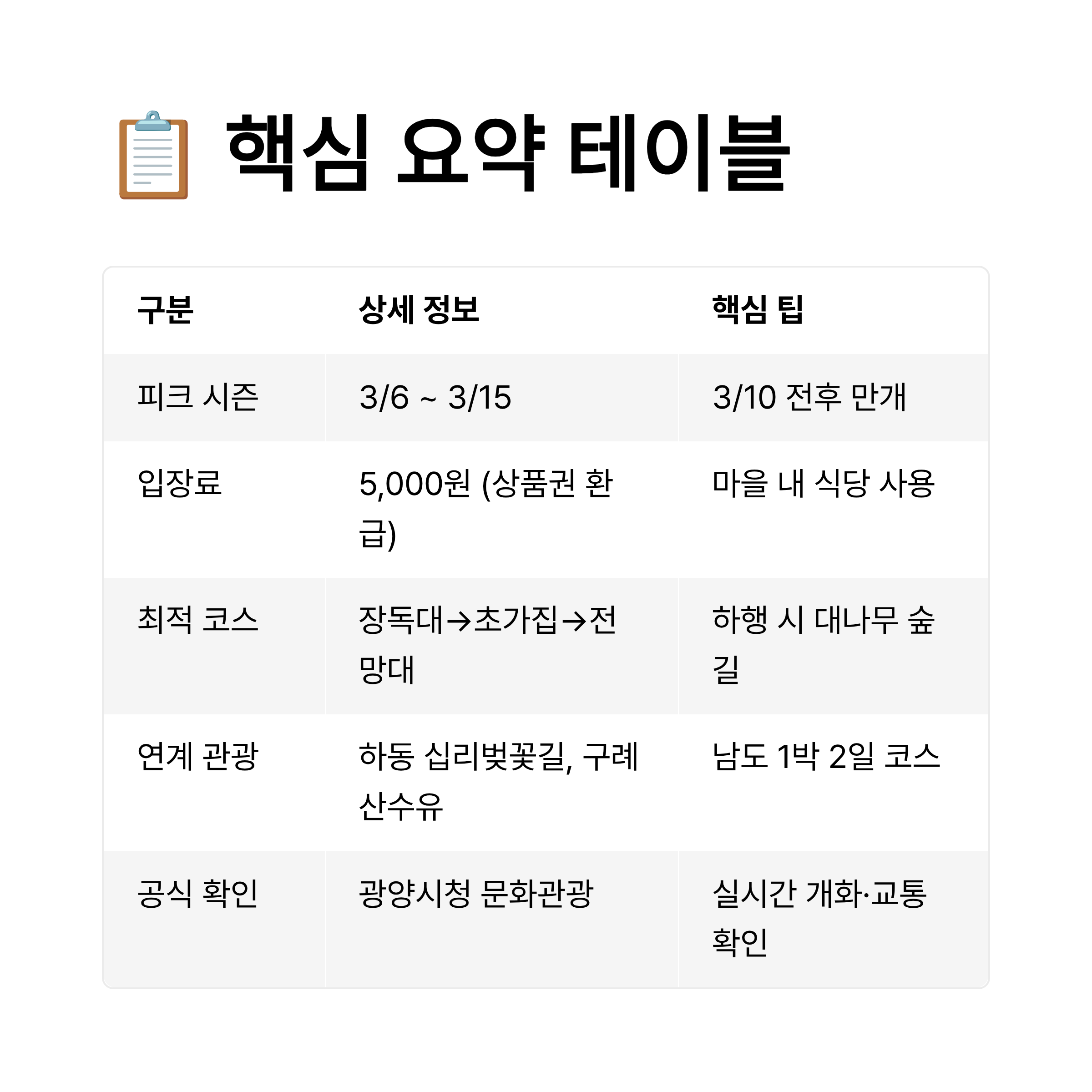 4. 2026 광양 매화 여행 핵심 요약 (Table)