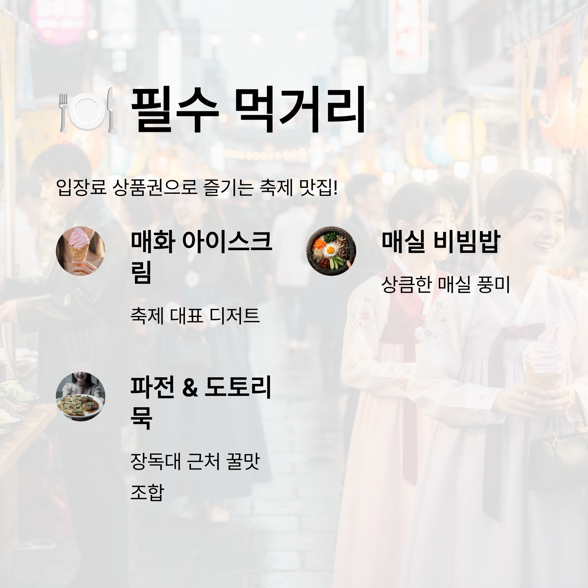 - 필수 먹거리: 입장료를 내고 받은 상품권으로 **'매화 아이스크림'**과 **'매실 비빔밥'**을 꼭 드셔보세요. 특히 장독대 근처에서 먹는 파전과 도토리묵은 꿀맛입니다.