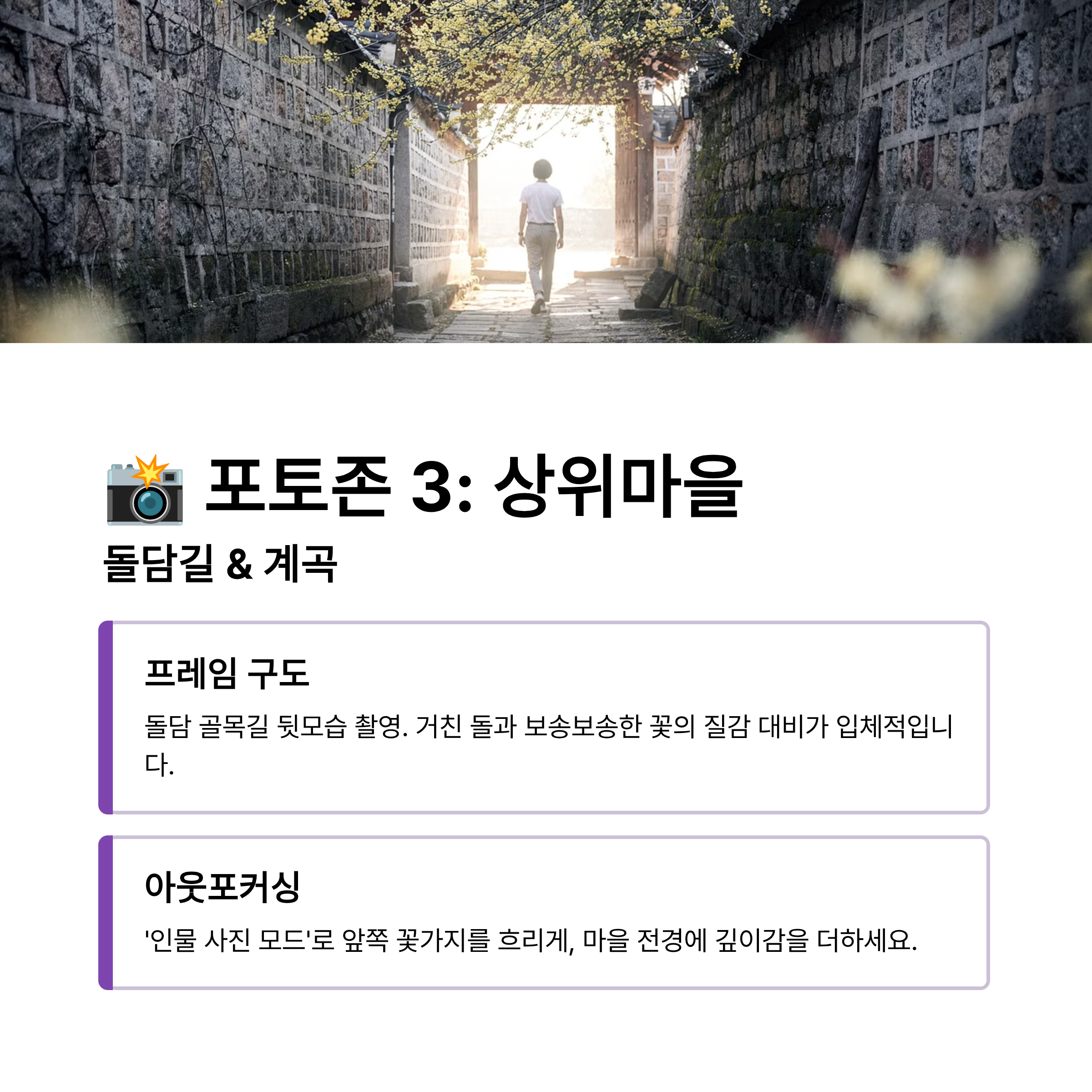 - 촬영 가이드 (프레임): 오래된 돌담 사이로 난 골목길을 걸어가는 뒷모습을 찍어보세요. 돌의 거친 질감과 산수유의 보송보송한 질감이 대비되어 입체적인 사진이 됩니다.
