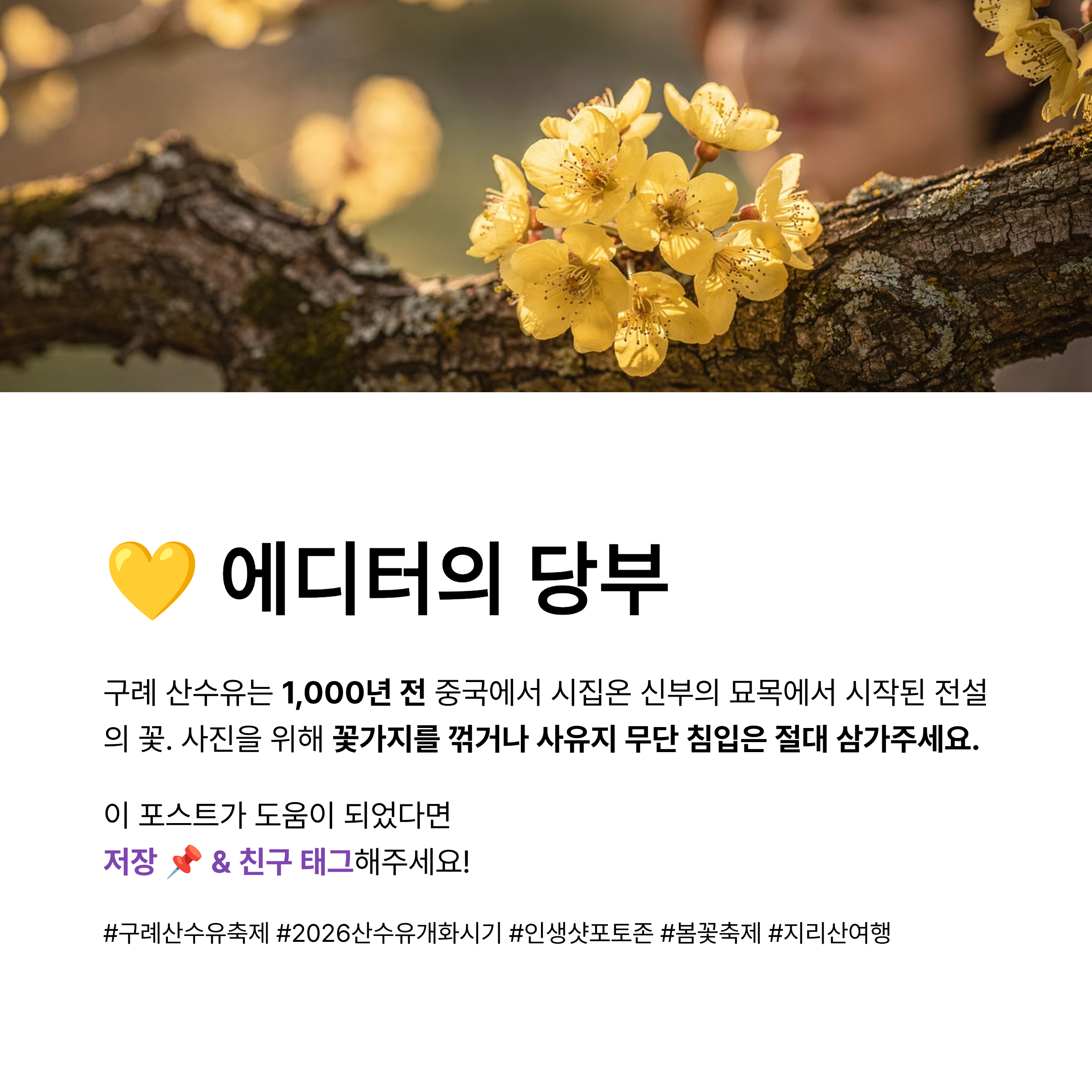 #구례산수유축제 #구례산수유마을 #2026산수유개화시기 #구례가볼만한곳 #반곡마을 #현천마을 #상위마을 #인생샷포토존 #지리산온천맛집 #구례여행코스 #봄꽃축제일정 #산수유촬영팁 #전남봄나들이 #지리산치즈랜드 #사성암 #화엄사 #전국꽃지도 #인생사진찍는법 #국내봄여행지 #주말가족여행