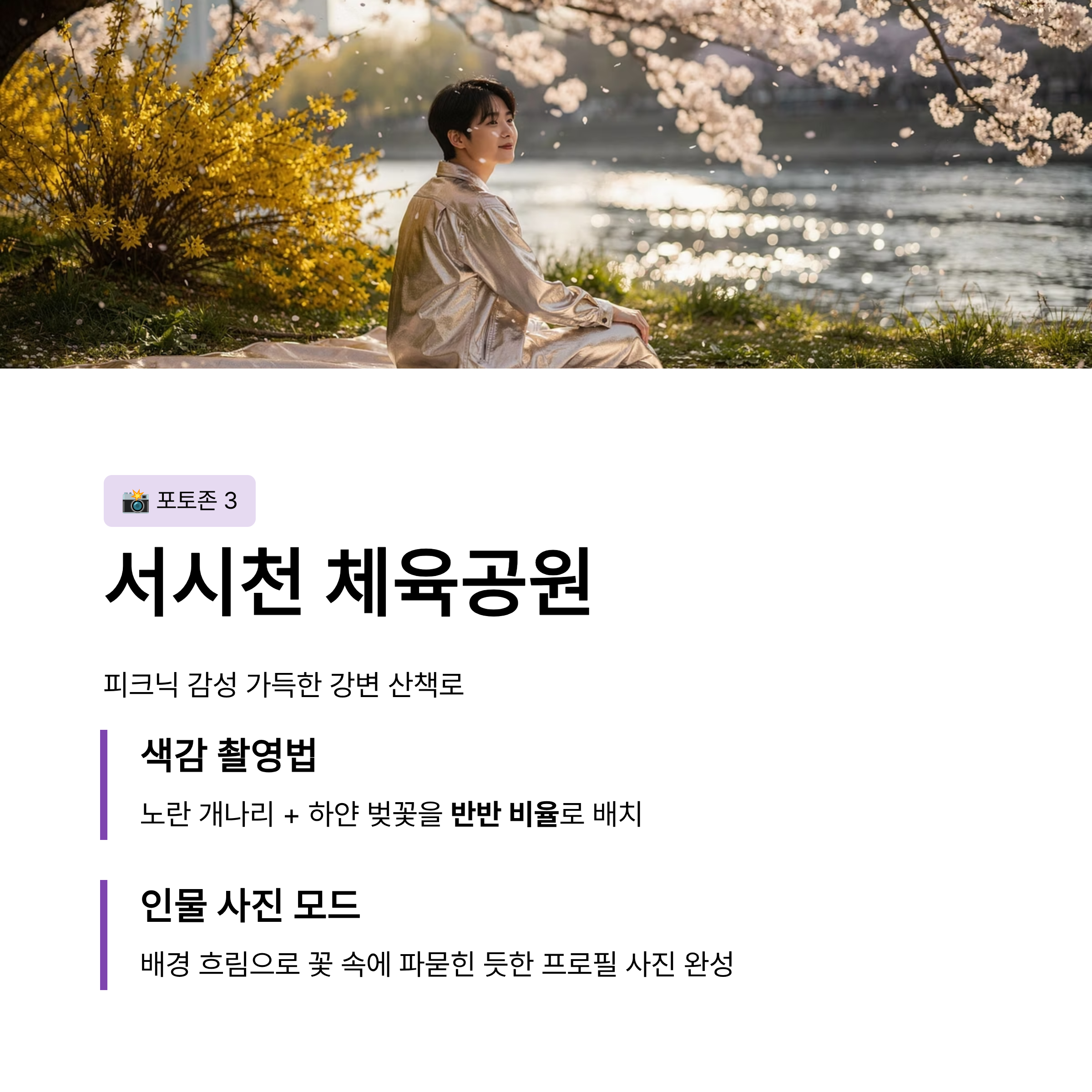 - 촬영 가이드 (색감): 아래쪽의 노란 개나리와 위쪽의 벚꽃을 반반 비율로 배치하세요. '인물 사진 모드'를 통해 뒷배경을 흐리면 꽃 속에 파묻힌 듯한 프로필 사진을 얻을 수 있습니다.