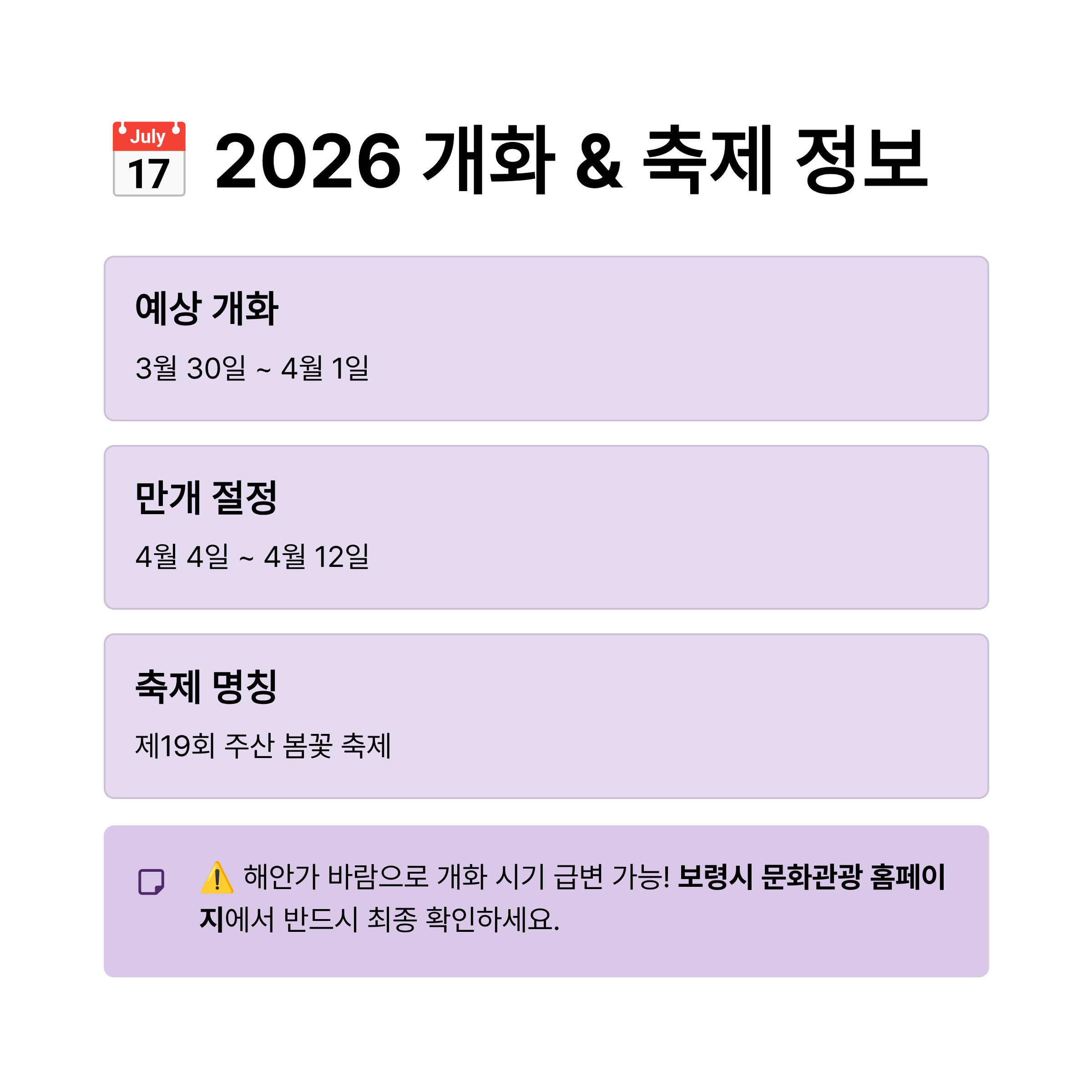 ⚠️ 방문 전 필수 확인 사항: 해안가 인근인 보령은 바람의 영향으로 개화 시기가 급격히 변동될 수 있습니다. 정확한 축제 일정과 실시간 꽃 상태는 반드시 보령시 문화관광 홈페이지에서 최종 확인하시길 바랍니다!