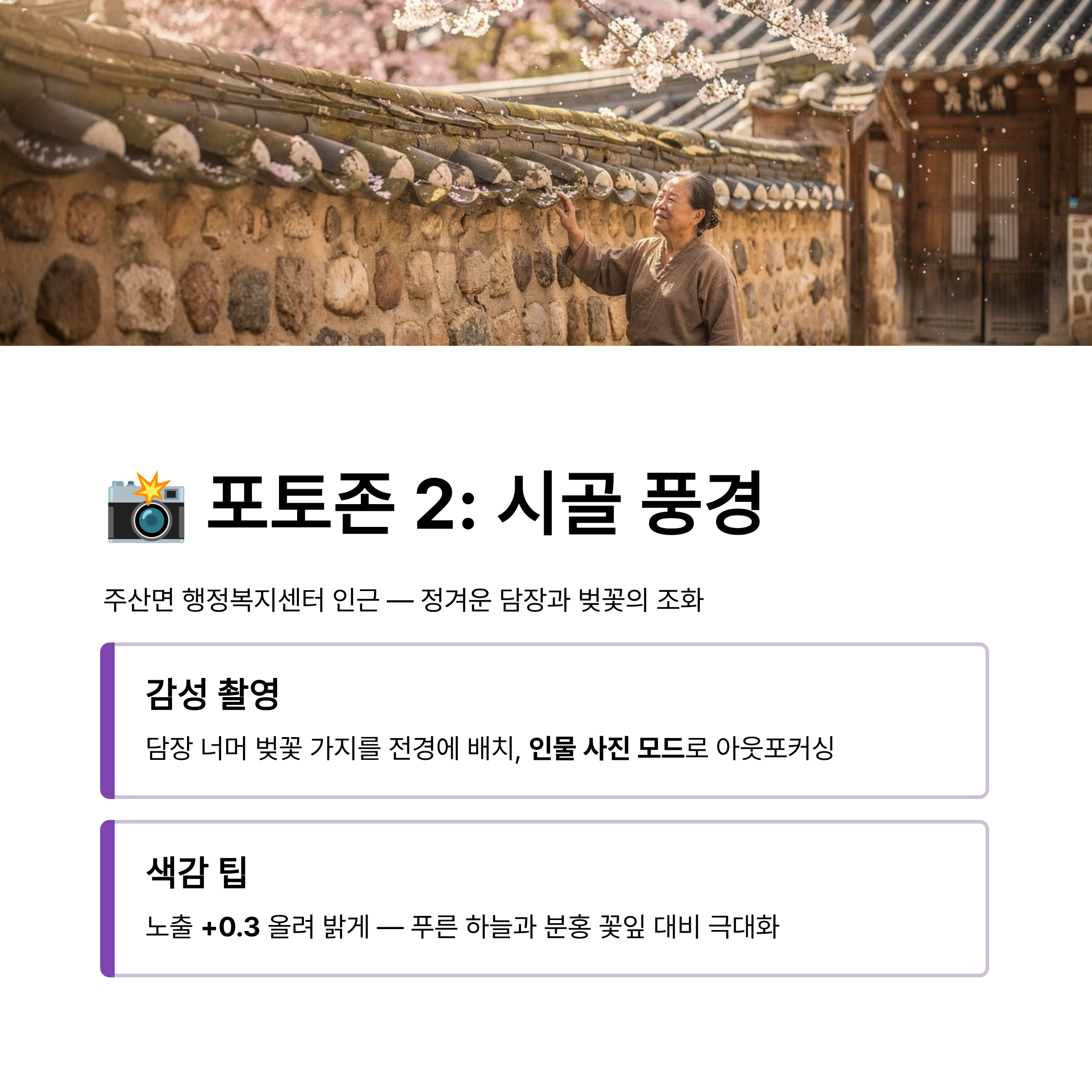 • 촬영 가이드 (감성): 낮은 담장 너머로 고개를 내민 벚꽃 가지를 인물의 앞쪽에 배치(전경 아웃포커싱)하세요. '인물 사진 모드'를 사용해 배경을 흐리게 처리하면 인물이 훨씬 돋보입니다.