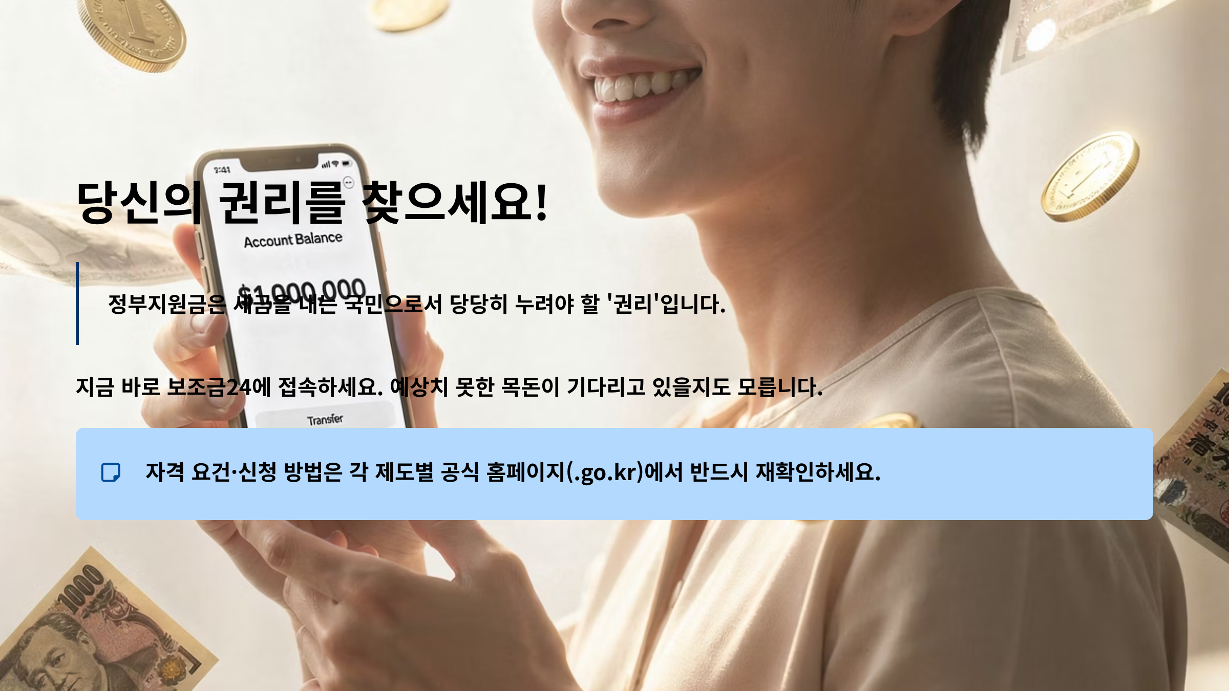 정부지원금은 세금을 내는 국민으로서 당당히 누려야 할 **'권리'**입니다. "귀찮아서", "나는 안 되겠지"라는 생각으로 넘기기엔 그 금액이 결코 작지 않습니다. 지금 바로 스마트폰을 켜고 보조금24에 접속해 보세요.