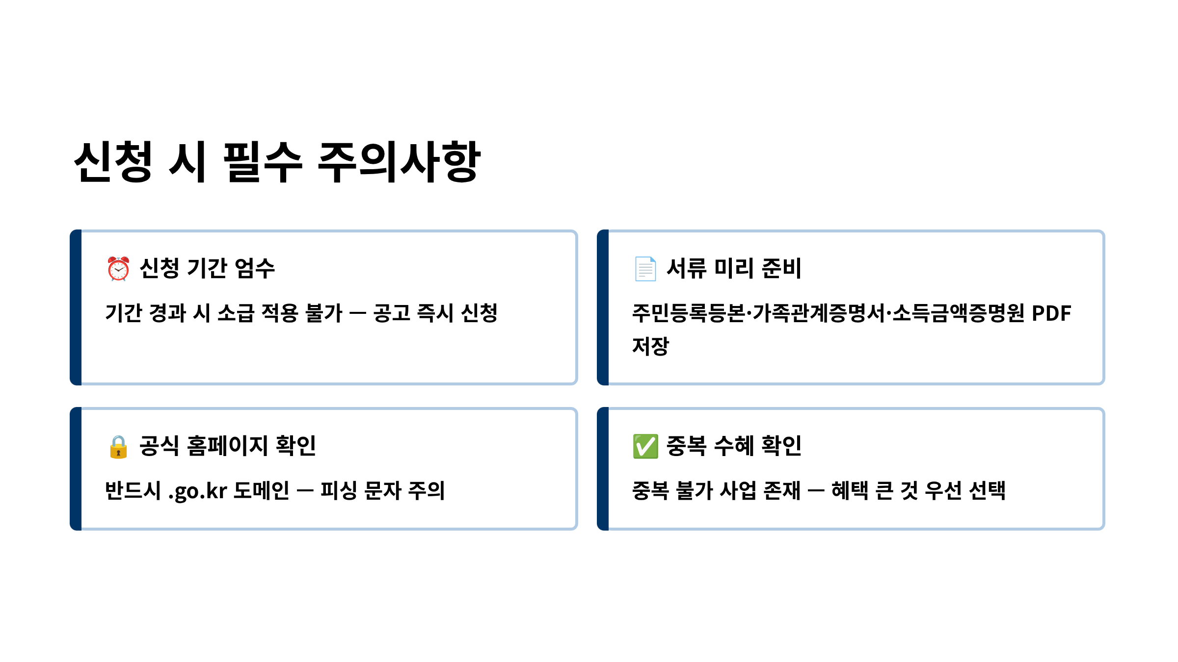 - 중복 수혜 여부: 어떤 사업은 타 지원금과 중복이 안 될 수도 있습니다. 가장 혜택이 큰 것을 우선순위로 두세요.