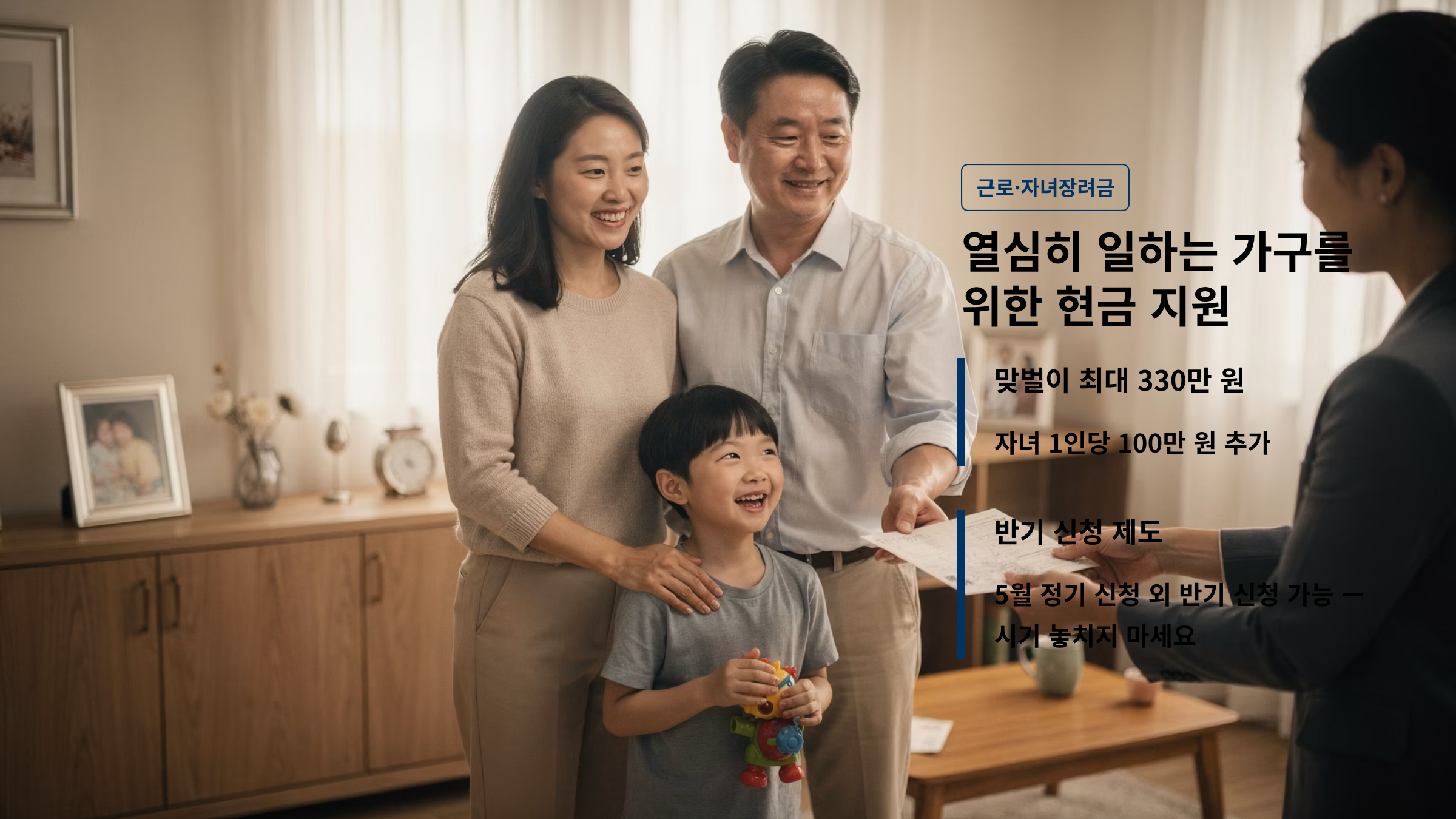 - 지원 금액: 맞벌이 가구 기준 최대 330만 원 (자녀 1인당 100만 원).