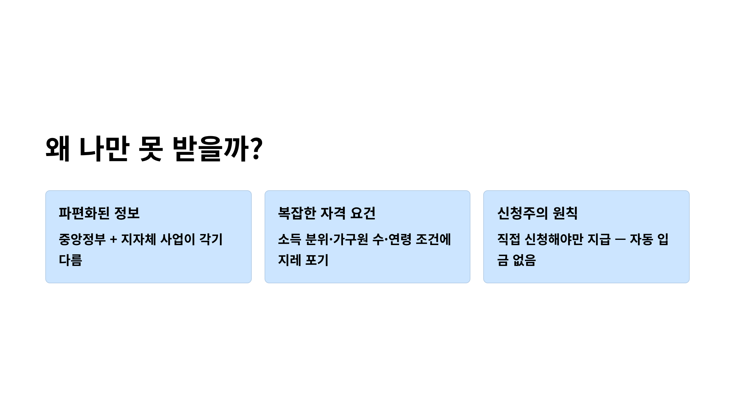 - 복잡한 자격 요건: 소득 분위, 가구원 수, 연령 등 조건이 까다로워 보여 지레 포기하게 됩니다.