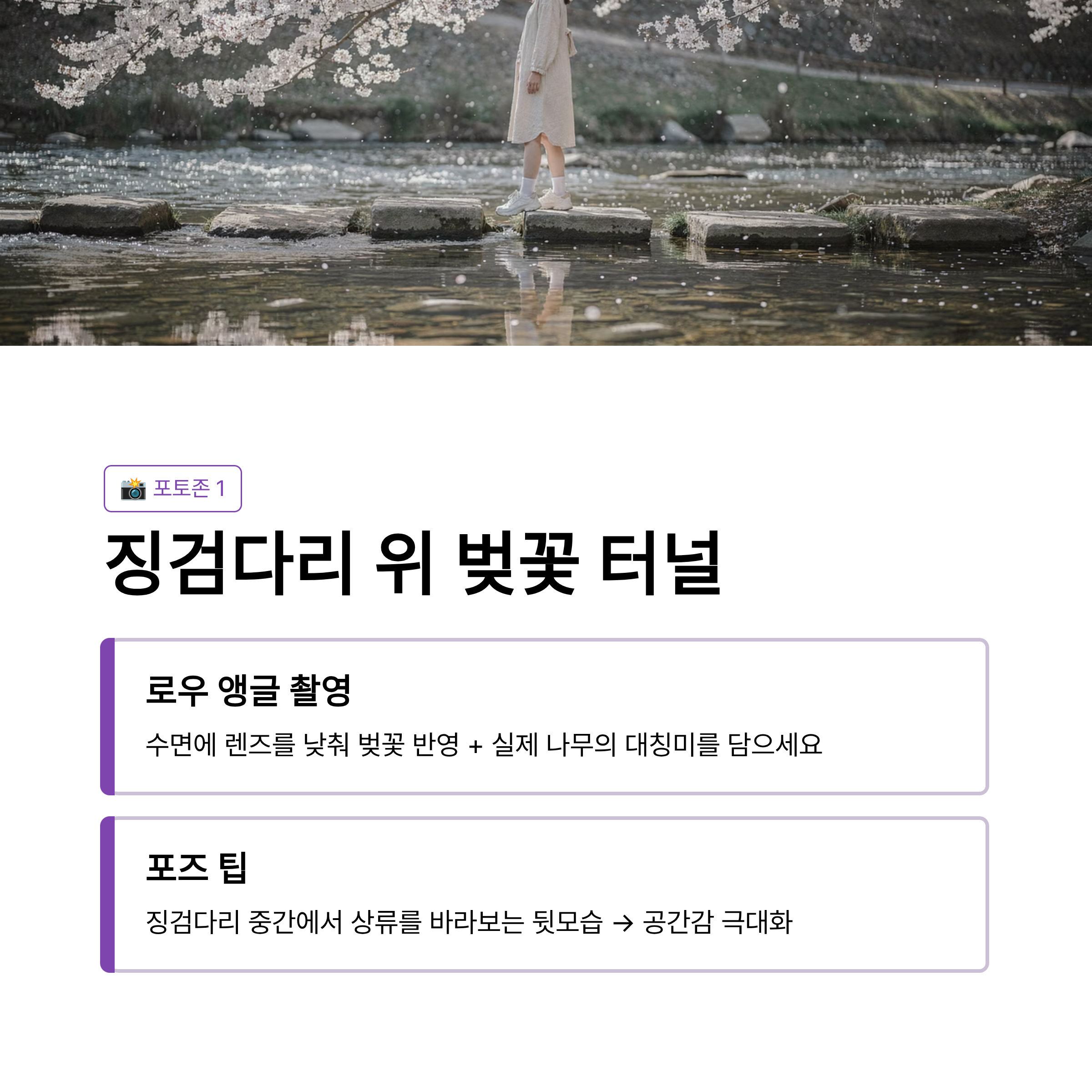 - 촬영 가이드 (반영): 바람이 없는 날, 물결이 잔잔할 때 징검다리 건너편에서 촬영해 보세요. 물 위에 비친 벚꽃과 인물의 반영(Reflection)이 데칼코마니 같은 예술적인 사진을 만들어줍니다.