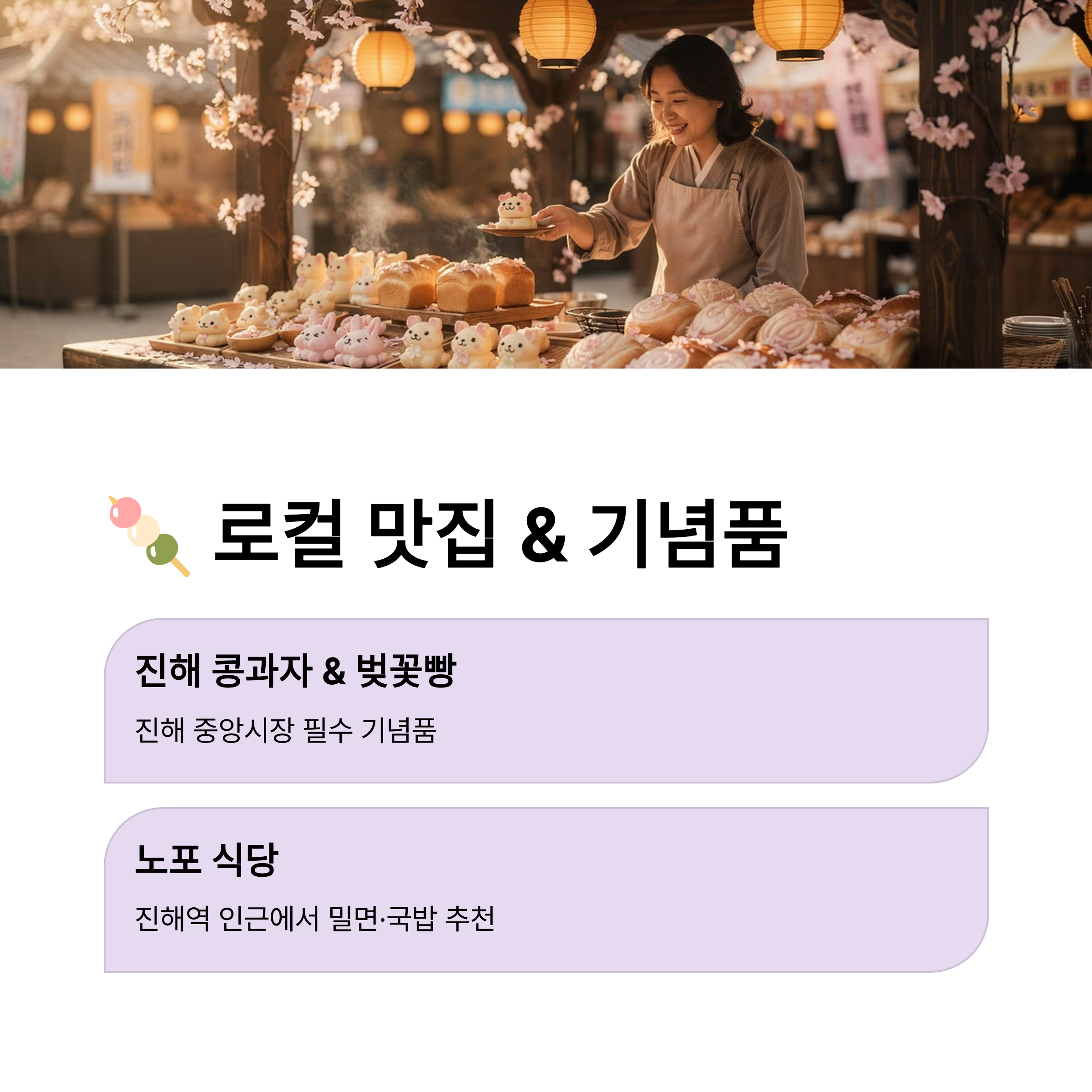 - 로컬 맛집: 진해 중앙시장의 **'진해 콩과자'**와 **'벚꽃빵'**은 필수 기념품입니다. 식사는 진해역 인근의 노포 식당에서 밀면이나 국밥을 즐겨보세요.