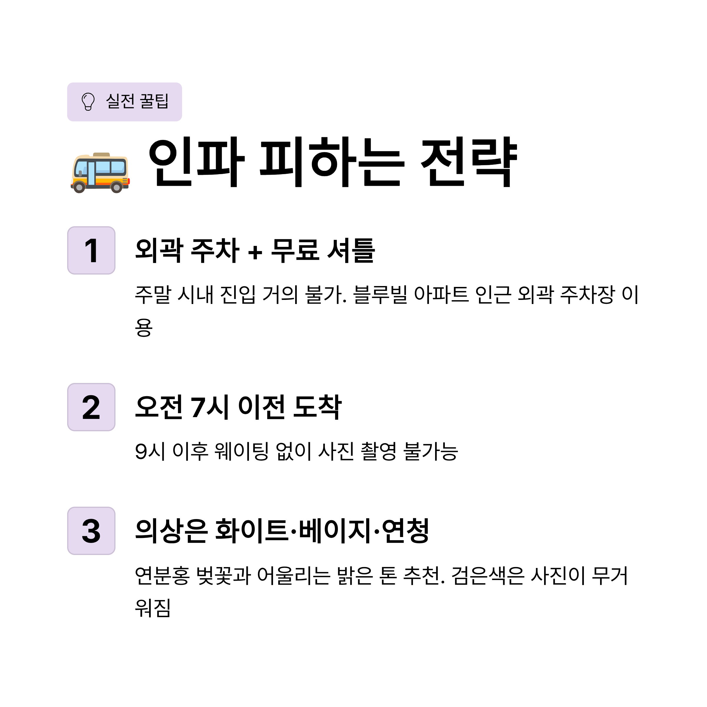 - 의상 추천: 벚꽃의 연분홍색을 살려주는 화이트, 베이지, 연청(데님) 계열의 옷을 추천합니다. 검은색 옷은 자칫 사진을 무겁게 만들 수 있습니다.