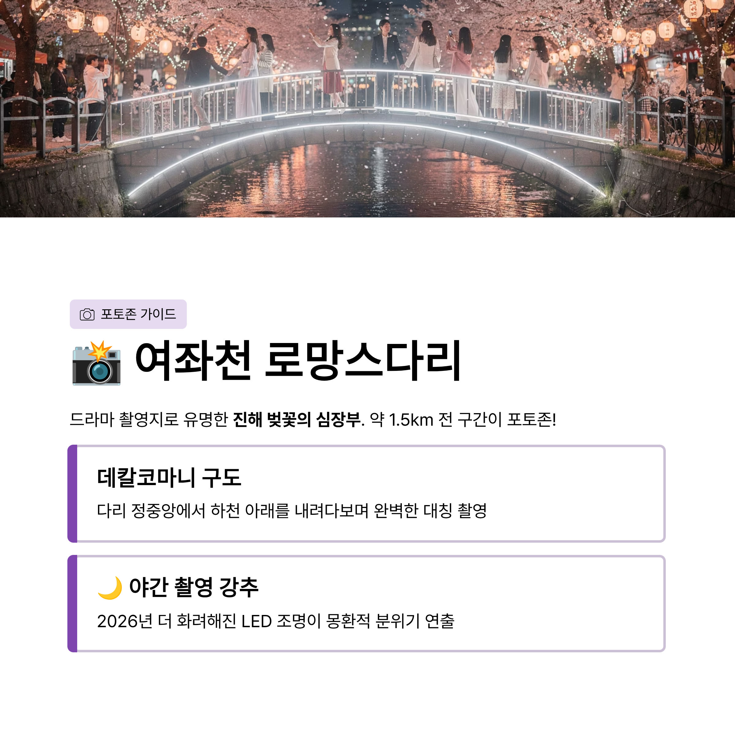- 촬영 팁: '야간 촬영'을 강력 추천합니다. 2026년에는 더욱 화려해진 LED 조명이 벚꽃을 비춰 낮과는 전혀 다른 몽환적인 분위기를 자아냅니다.
