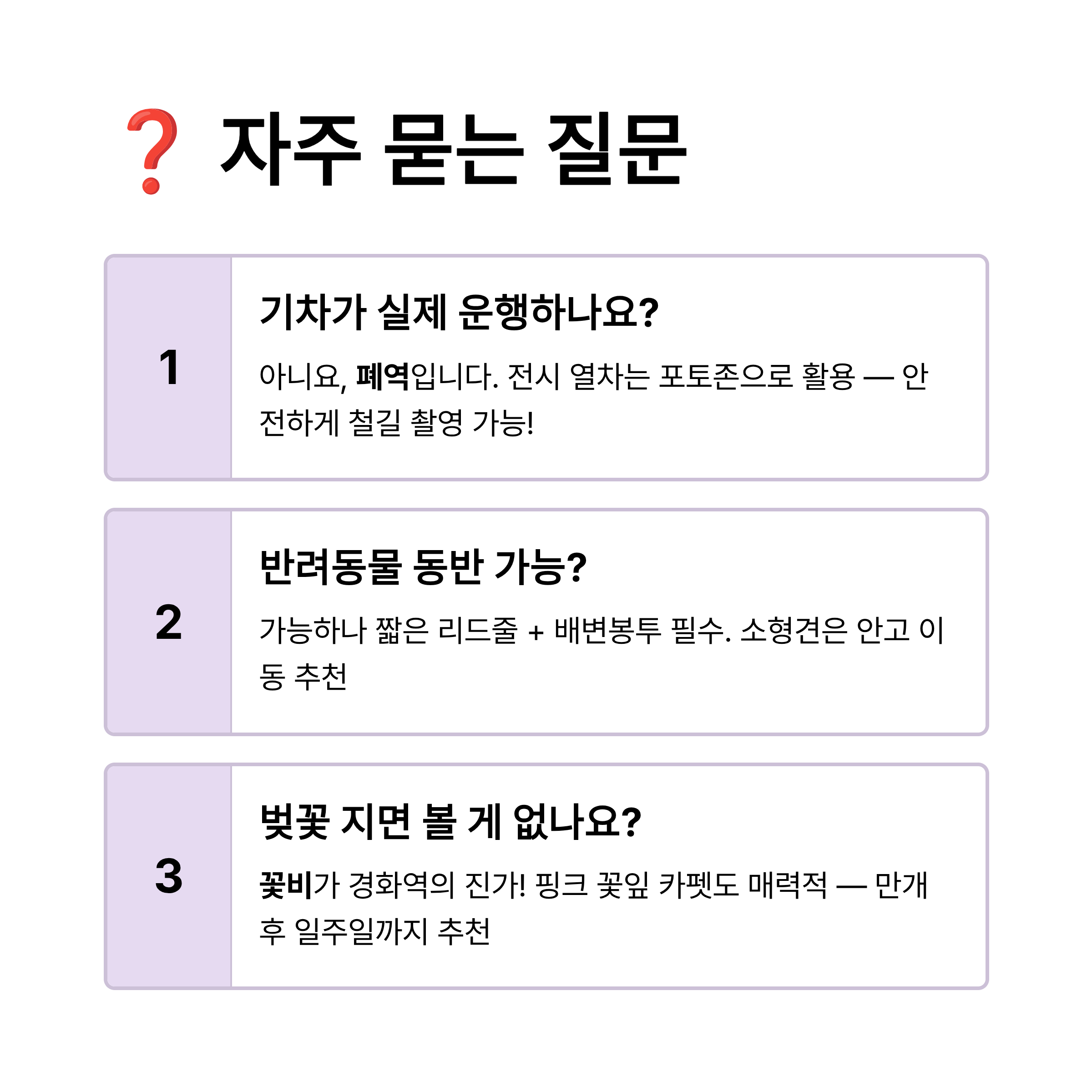 | 주요 포토존 | 철길 기차 헤드, 벚꽃 터널 중심부 | 줌 렌즈를 활용한 압축 구도 |