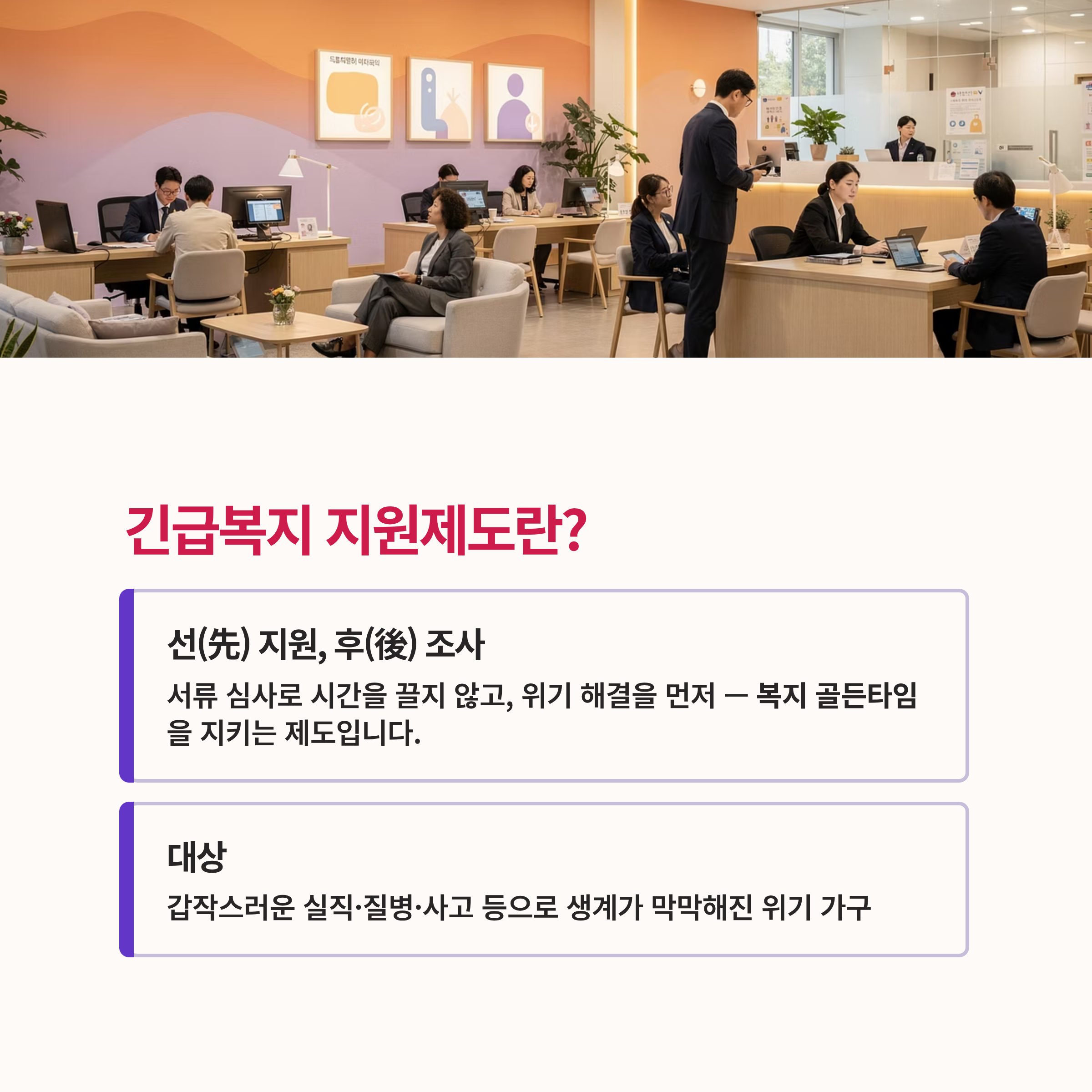 긴급복지 지원제도는 생계 곤란 등의 위기 상황에 처하여 도움이 필요한 사람에게 선(先) 지원, 후(後) 조사 원칙에 따라 신속하게 지원하는 제도입니다. 즉, 서류 심사로 시간을 끌기보다 당장의 위기 해결을 우선시하는 '복지 골든타임'을 지키기 위한 제도라 할 수 있습니다.