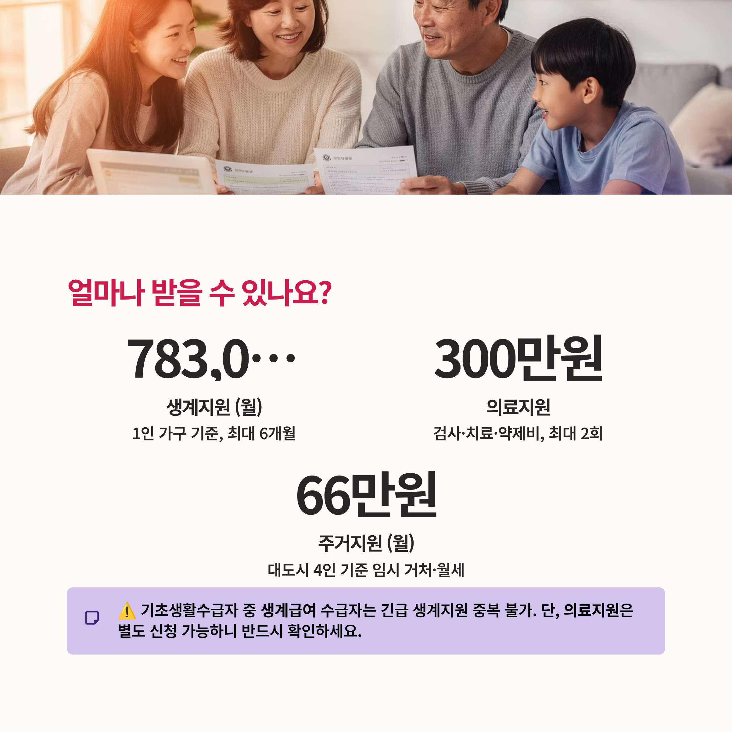 주의사항: 기초생활수급자 중 생계급여를 이미 받고 계신 분은 긴급 생계지원을 중복으로 받을 수 없습니다. 하지만 의료비가 급한 경우 의료지원은 별도로 신청 가능한 경우가 많으니 반드시 확인하세요.