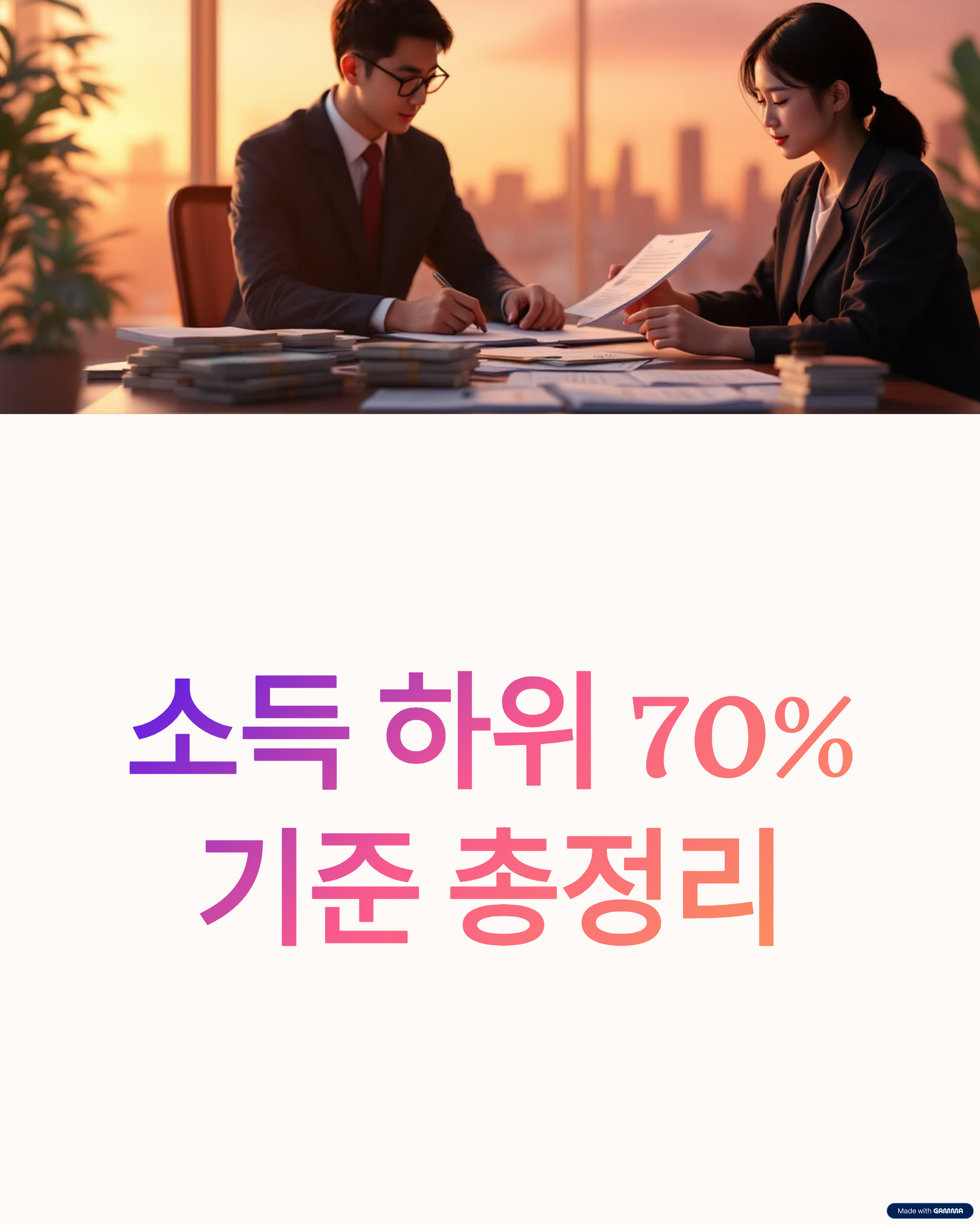 정부가 정책을 집행할 때 사용하는 **'소득 하위 70%'**는 대한민국 전체 가구를 소득 순으로 세웠을 때, 가장 소득이 높은 상위 30%를 제외한 나머지 70% 가구를 의미합니다.