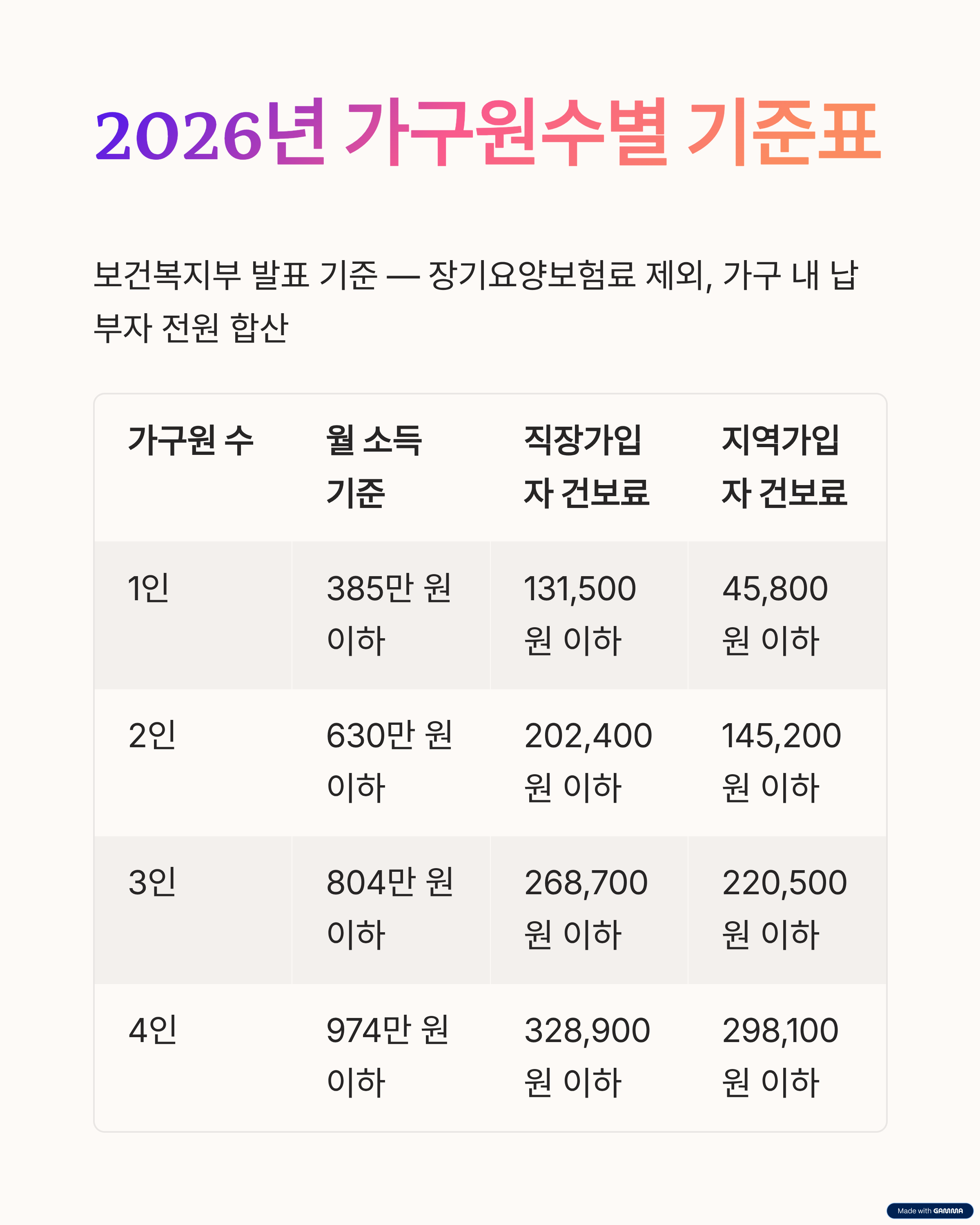 - [표] 2026년 가구원수별 소득 및 건보료 컷트라인 (1인~4인)