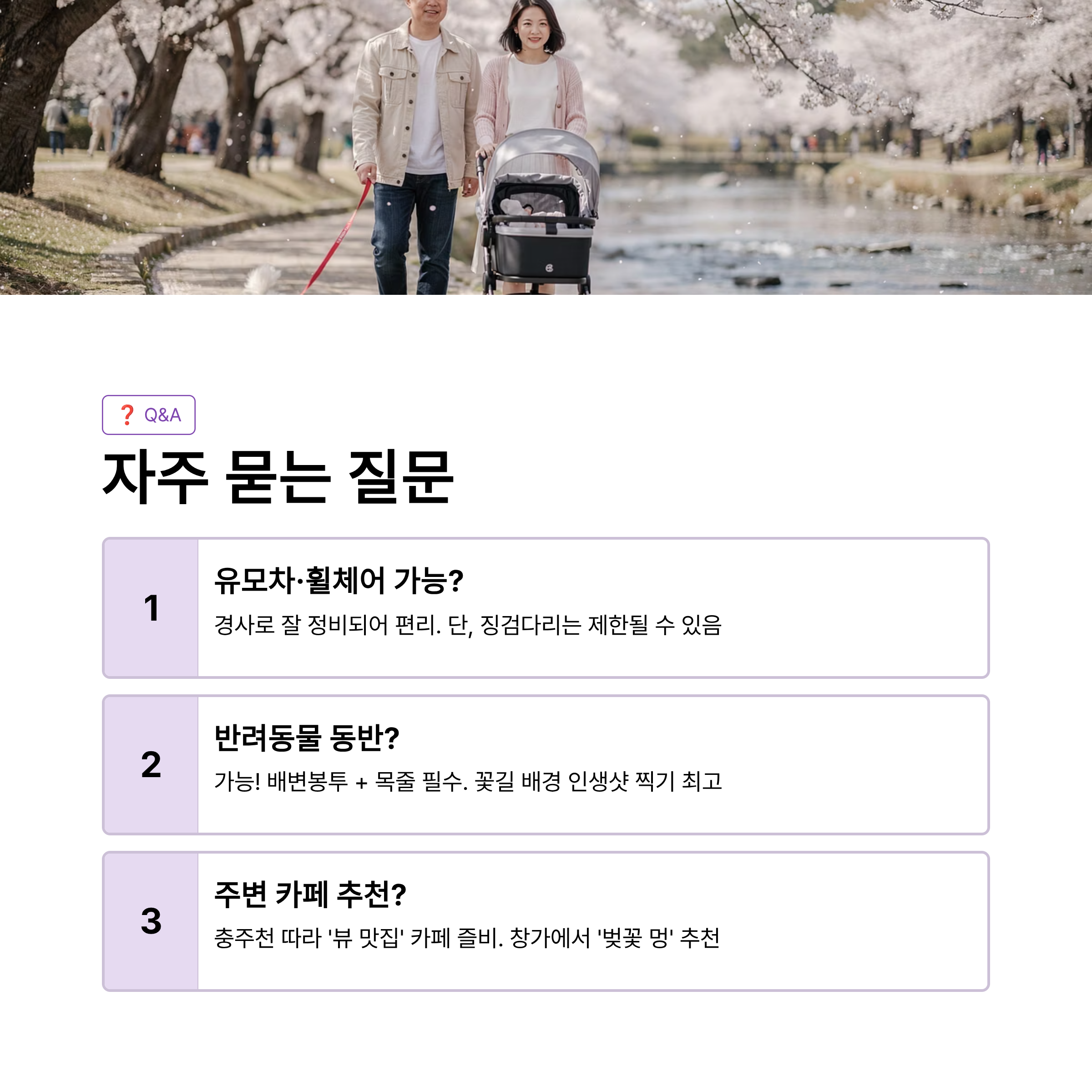 A1. 네, 충주천 산책로는 경사로가 잘 정비되어 있어 이동이 매우 편리합니다. 다만, 징검다리 이용은 제한될 수 있습니다.