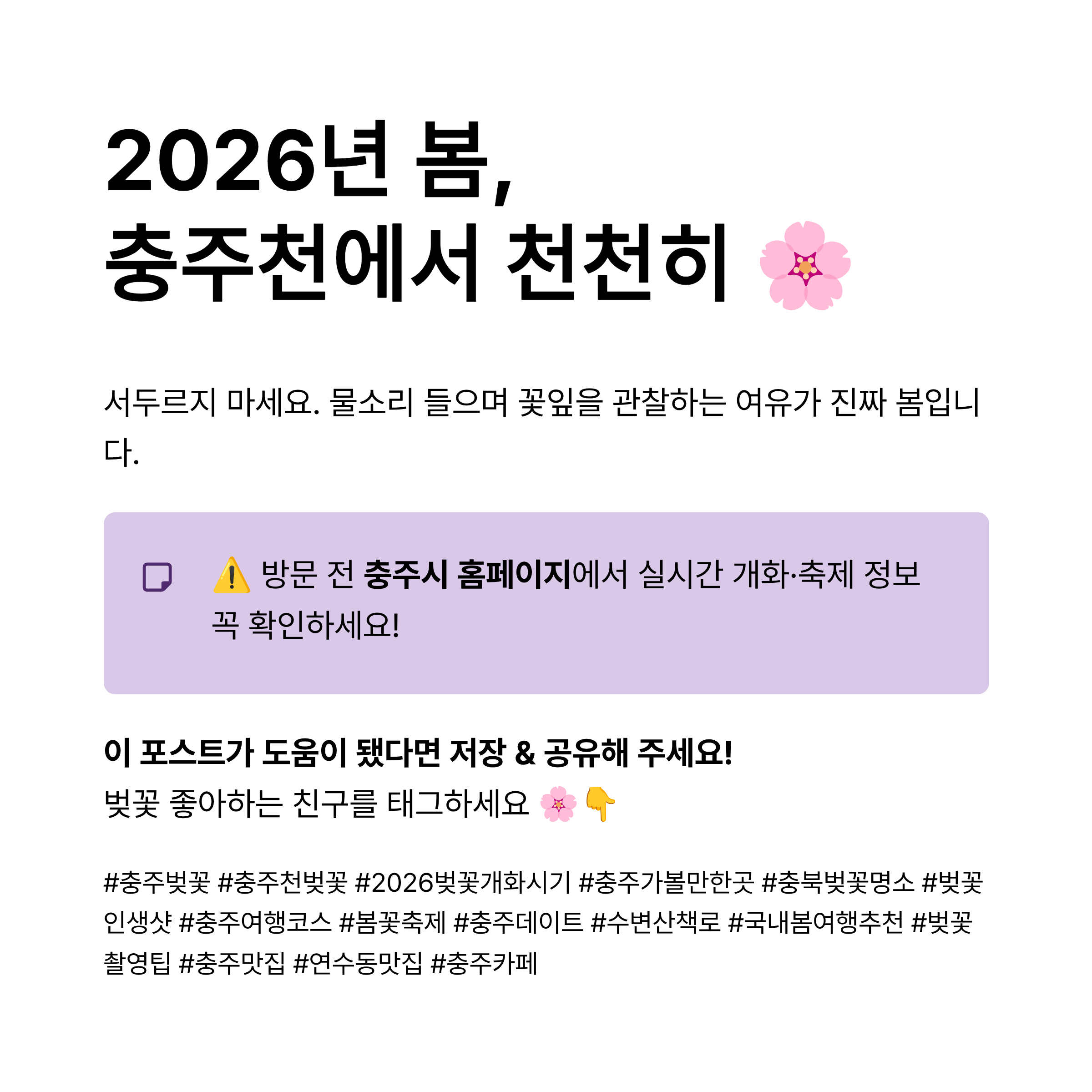 #충주벚꽃 #충주천벚꽃 #2026벚꽃개화시기 #충주가볼만한곳 #충북벚꽃명소 #벚꽃인생샷 #충주여행코스 #봄꽃축제 #충주데이트 #수변산책로 #국내봄여행추천 #벚꽃촬영팁 #충주맛집 #연수동맛집 #충주카페 #전국벚꽃명소 #충청도벚꽃 #벚꽃출사 #주말가족나들이 #충주벚꽃축제